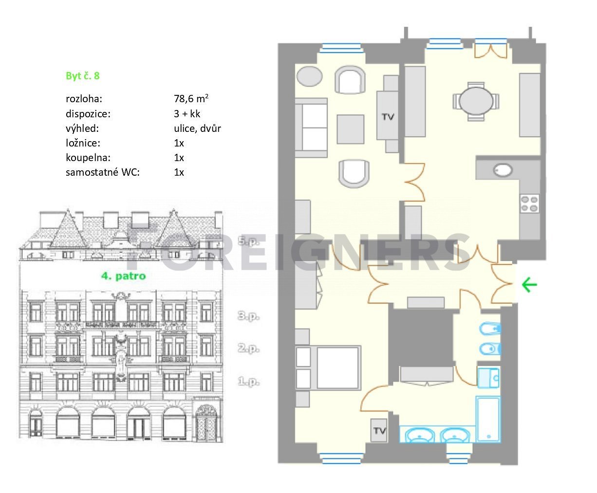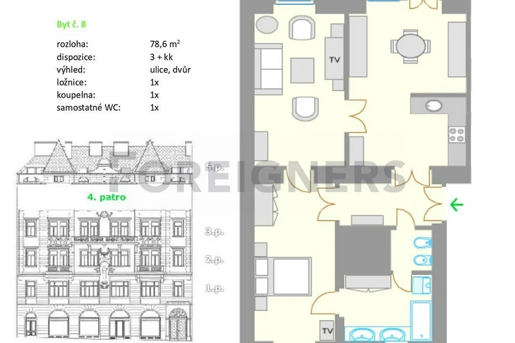 We offer for long-term rent an elegant, fully furnished apartment with a 2+1 layout and a total area of 78 m², located on the 4st floor of a representative historic building after complete renovation with an elevator.