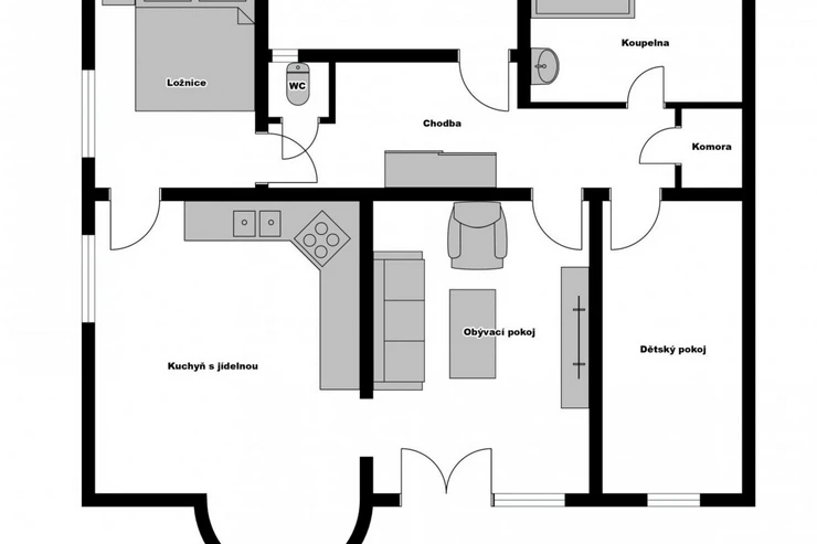 Byt zaujme především logicky řešenou dispozicí a dostatkem denního světla. Obývací pokoj je samostatný, což zajišťuje komfortní oddělení denní a klidové části bytu. Kuchyň je řešena jako samostatný prostor s jídelním koutem, ideální pro každodenní fungování i rodinné stolování.