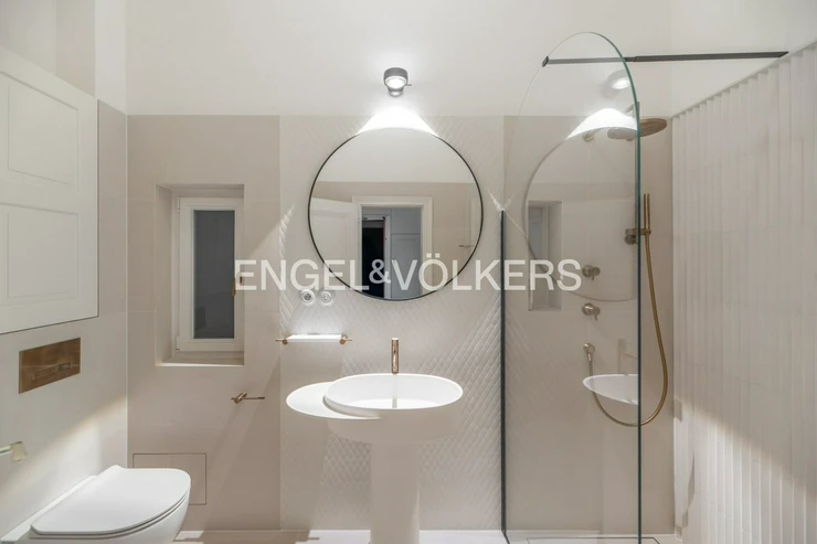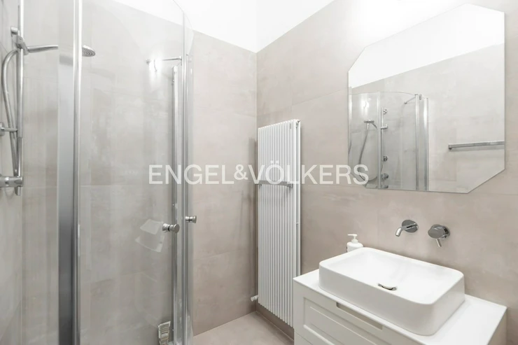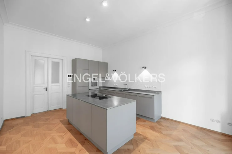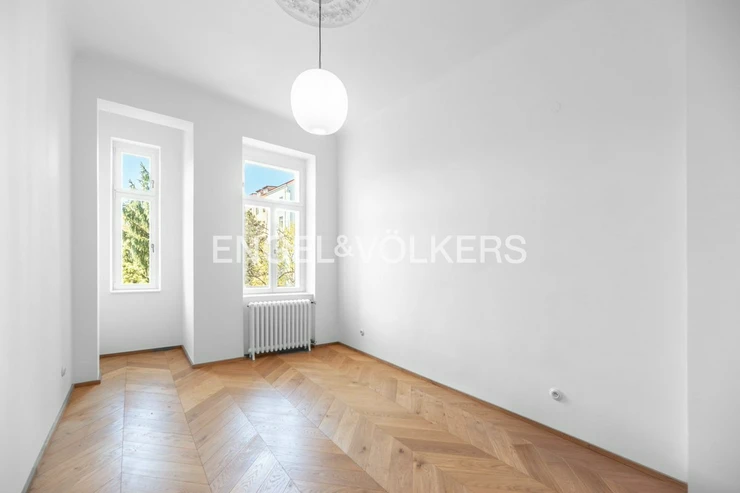 The apartment has undergone a complete high-standard renovation and impresses especially with its attention to detail – renovated stucco on the ceilings, brass elements on the radiators and in the bathrooms, and solid wood floors in three patterns give the interior a unique character. The apartment includes a cellar. Parking can be arranged for an additional fee in a stacking system approx. 200 m from the building.