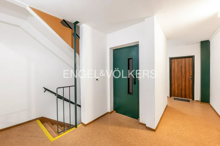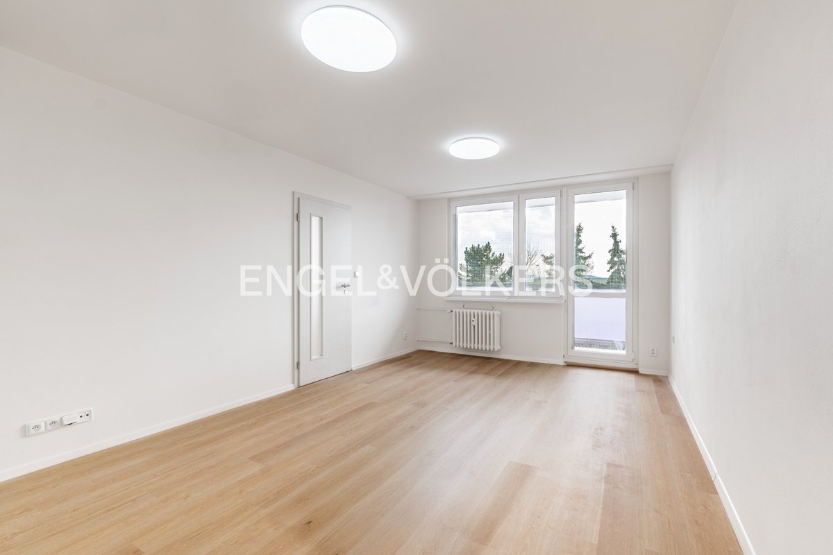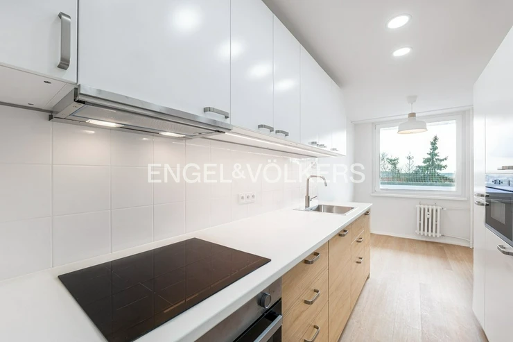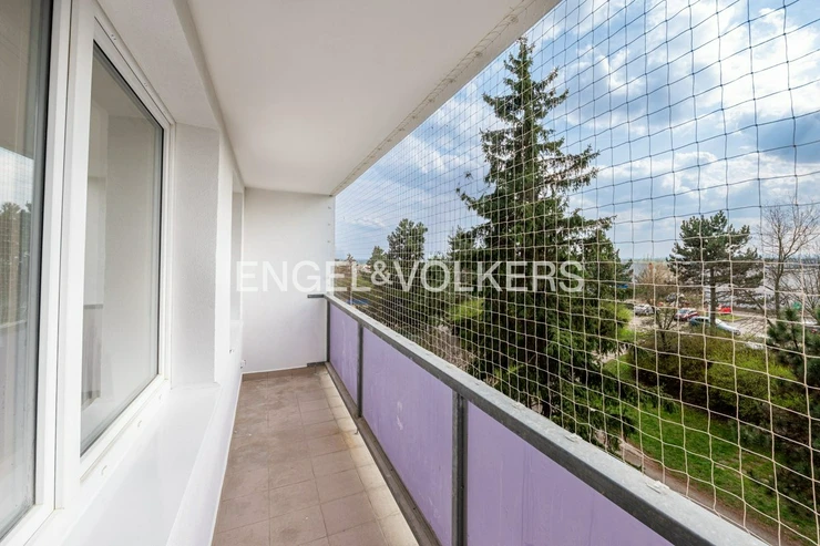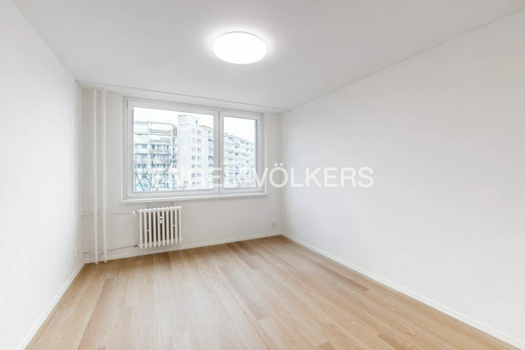The apartment is located on the 2nd floor of a prefabricated building with an elevator in the Stodůlky neighbourhood. The practical layout features an entryway leading to the individual rooms, a kitchen equipped with all appliances and connected to the dining area, a spacious living room with access to a balcony overlooking greenery, and two separate bedrooms. The apartment features a separate toilet, a bathroom with a bathtub, and a utility room.