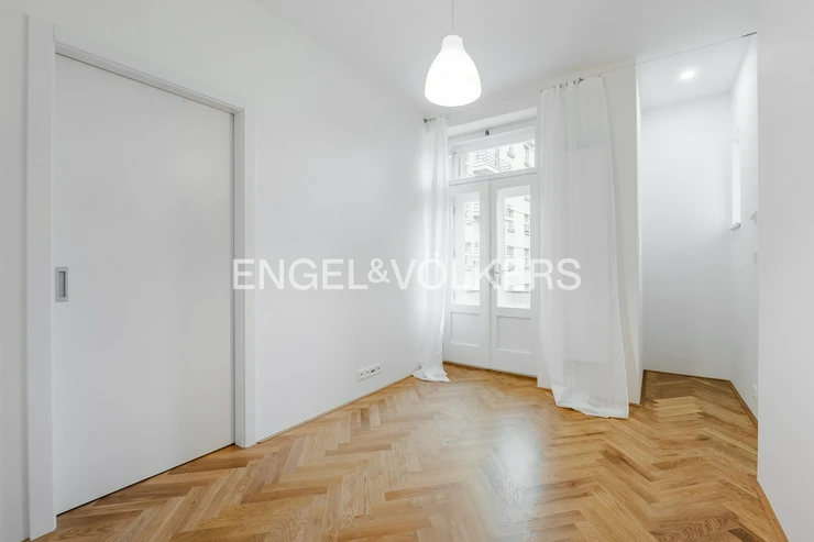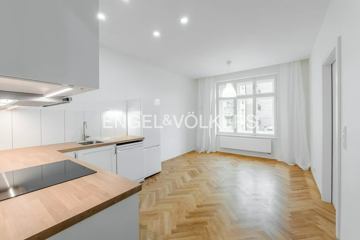 The layout consists of a living room with a kitchenette, a bedroom, and a bathroom with a shower. The apartment also includes a practical utility room housing the gas boiler and a connection for a washing machine. The apartment is part of a development project, has never been lived in, and offers a high standard – solid oak floors, large-format tiles, and new windows with insulating double glazing. The kitchen unit is fully equipped with appliances. The apartment is oriented toward the courtyard and features a balcony. A cellar in the basement of the building belongs to the apartment.