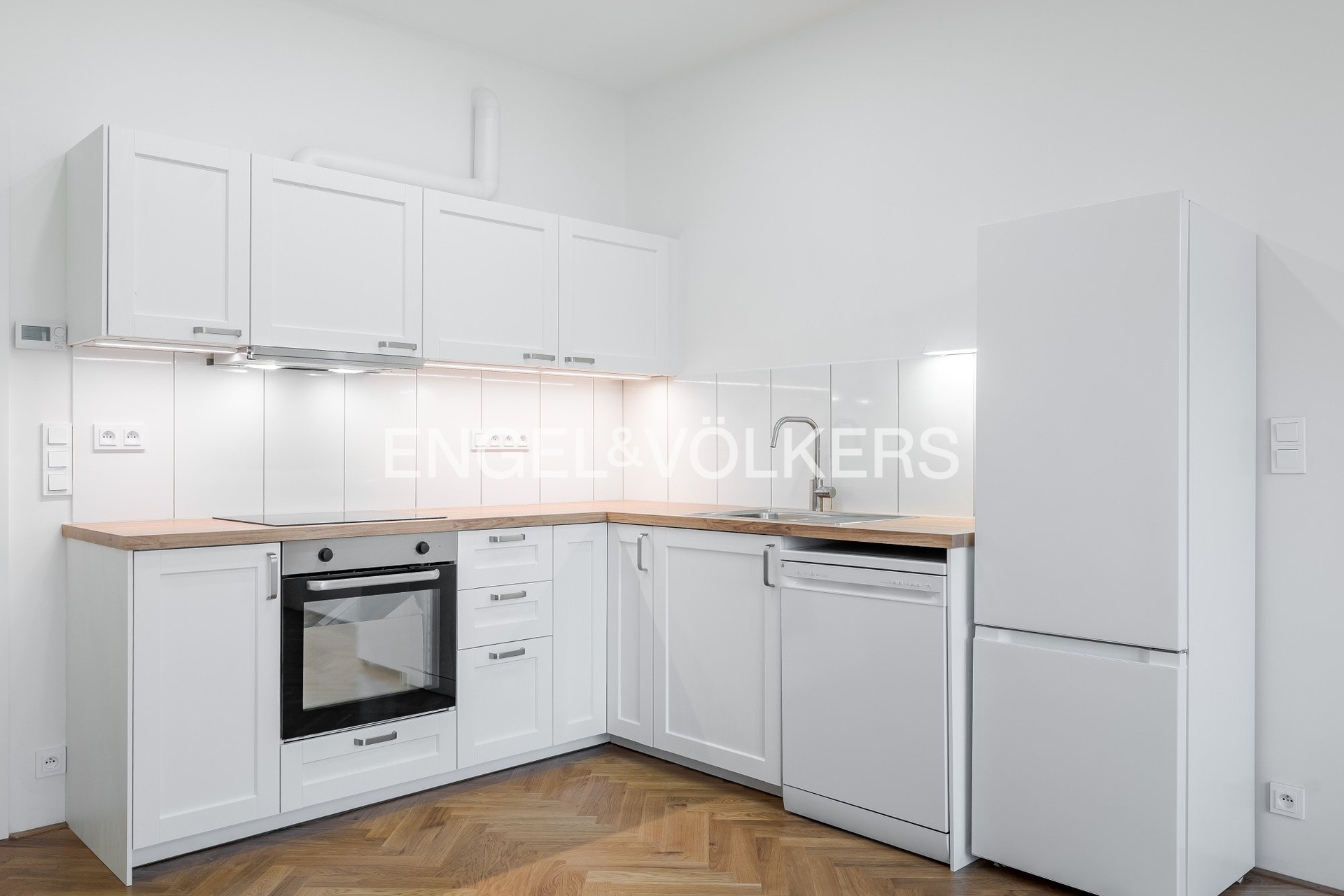 We offer for rent a brand-new 2+kt apartment with an area of 44 sqm, located on the 4th floor (3rd floor above ground) of a building in Blanická Street, Prague 2 – Vinohrady.