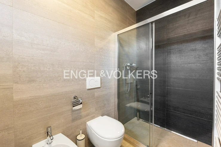 The interior consists of an entrance hall with built-in wardrobes, a spacious living room connected to a fully equipped kitchen (induction hob, oven, fridge-freezer, dishwasher, microwave), and two separate bedrooms. One of the bedrooms has its own en-suite bathroom with a shower, toilet, and bidet; the second bathroom, accessible from the hallway, is equipped with a bathtub, toilet, and bidet. The apartment also includes a utility room with a washing machine, dryer, and gas boiler. The living room faces the greenery of Svatopluk Čech Orchards, while the bedrooms face a quiet courtyard.