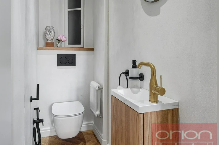 The apartment features a fully equipped kitchen with a dining area, a spacious living room, two bedrooms, a walk-in closet, two bathrooms with showers and toilets, and an additional separate toilet. The apartment is equipped with a washing machine, dryer, Wi-Fi, and a security system. Wooden parquet floors are installed throughout.