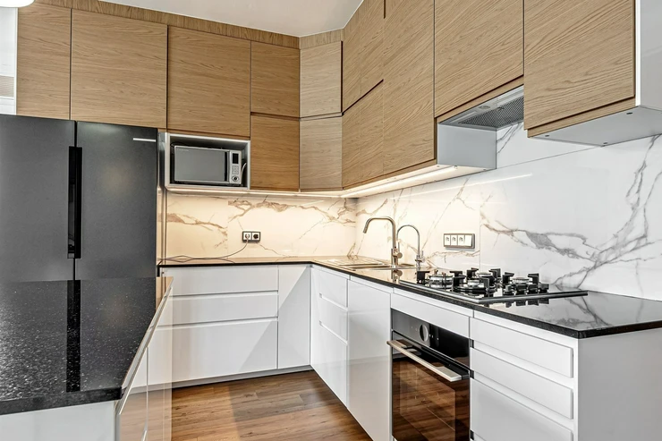 The modern kitchen is equipped with high-quality built-in appliances by BOSCH, including an American-style fridge, gas cooktop, electric and microwave oven, dishwasher and extractor hood. A dominant feature of the space is a large solid wood dining table, ideal for family dining or entertaining guests.