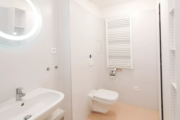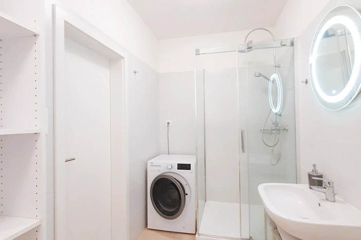 Other equipment of the apartment: modern furniture according to the photos, a fully equipped design kitchen unit including built-in appliances (electric cooking hob, electric oven, dishwasher, microwave, and refrigerator with freezer), LCD Tv set, washing machine combined with dryer, the apartment also has cabling for high-speed internet connection (up to 1 Gb/s), wooden floors, outside safety sun blinds, and central heating.
