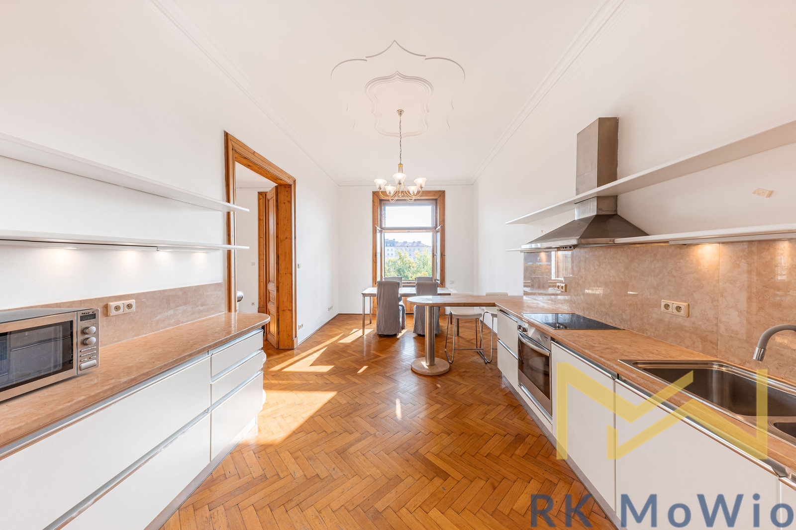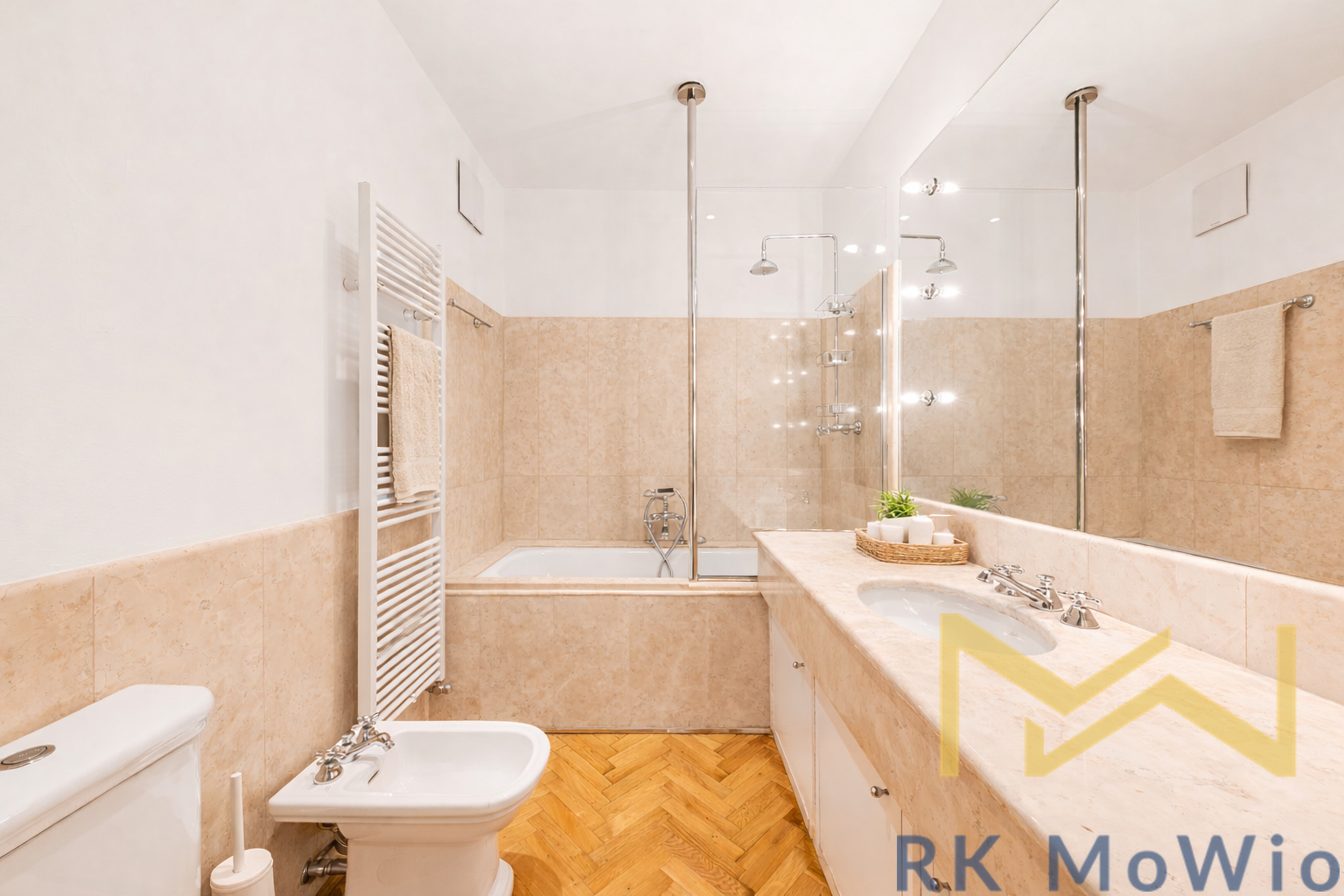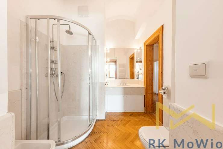 The layout consists of an entrance hall, a spacious living room, a separate kitchen with a dining area, four separate bedrooms, three bathrooms (bathtub/shower, washbasin, toilet), a separate toilet, a storage room, and a balcony. The layout allows for a comfortable separation of living and private areas and provides ample space even for demanding clients. The apartment is equipped with a fully fitted kitchen with appliances, high-quality wooden floors, original doors and windows enhancing the unique character of the interior. Comfort is further increased by air conditioning, a security system, a washing machine, and a dryer. The apartment is unfurnished and ready for customization according to the tenant’s needs. Garage parking space available for an extra fee of CZK 5,000/month.