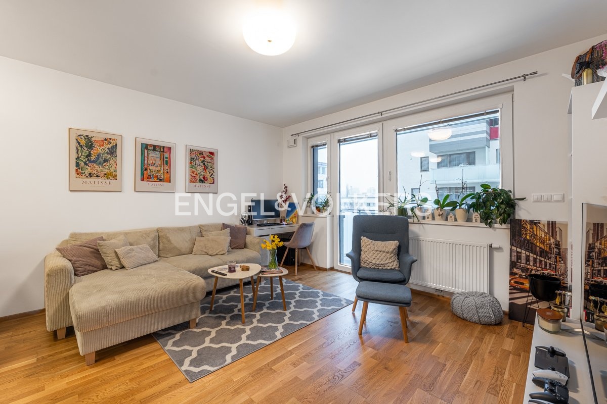 The apartment consists of a living room with a kitchenette, a separate bedroom, a hallway, a bathroom, a separate toilet, and a balcony. The kitchen unit is equipped with all appliances (hob, oven, hood, refrigerator, dishwasher). Access to the balcony is from both the living room and the bedroom.