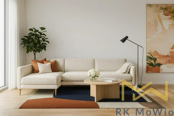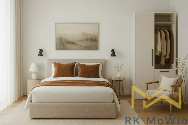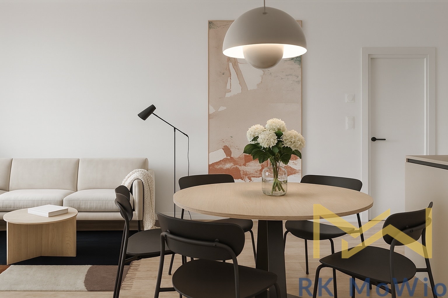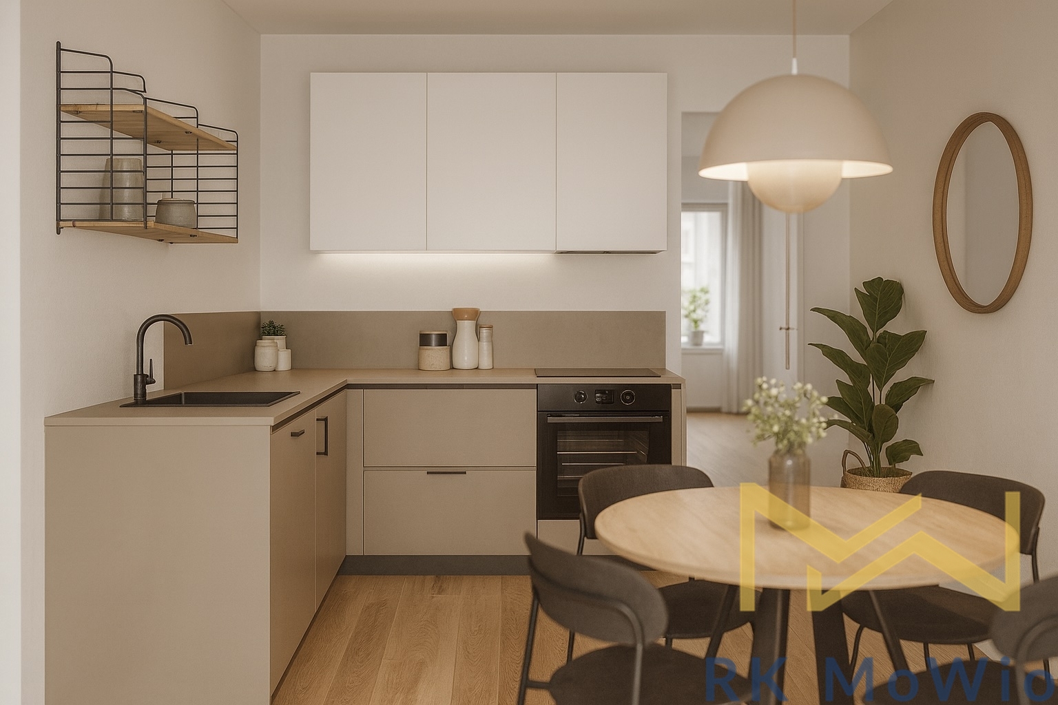 The layout of the apartment includes an entrance hall, a living room with a kitchenette and dining area, 1 bedroom, and 1 bathroom (with bathtub/shower, washbasin, and toilet). Apartment equipment includes: kitchen unit (including fridge with freezer, glass-ceramic cooktop, extractor hood, dishwasher, and electric oven), built-in wardrobes, high-speed internet connection preparation, wooden floors, and tiles. It is possible to rent a parking space and a cellar for an additional fee. Photos are illustrative.