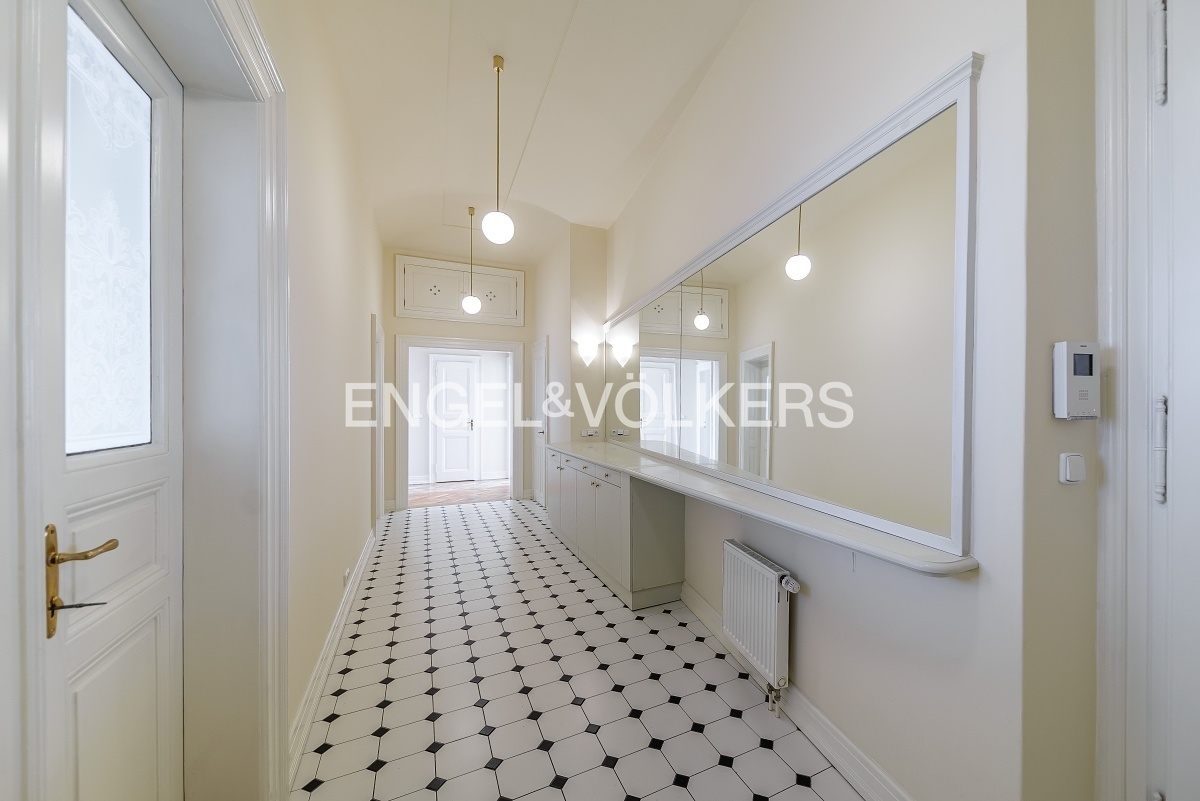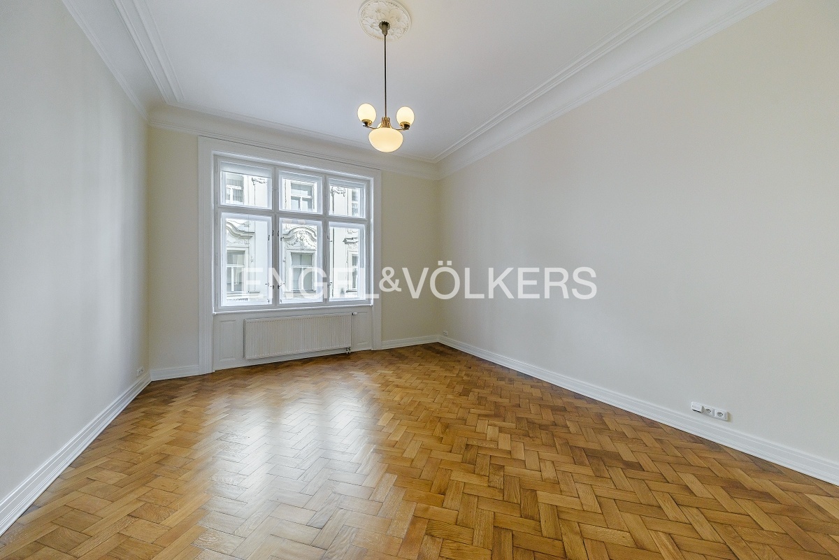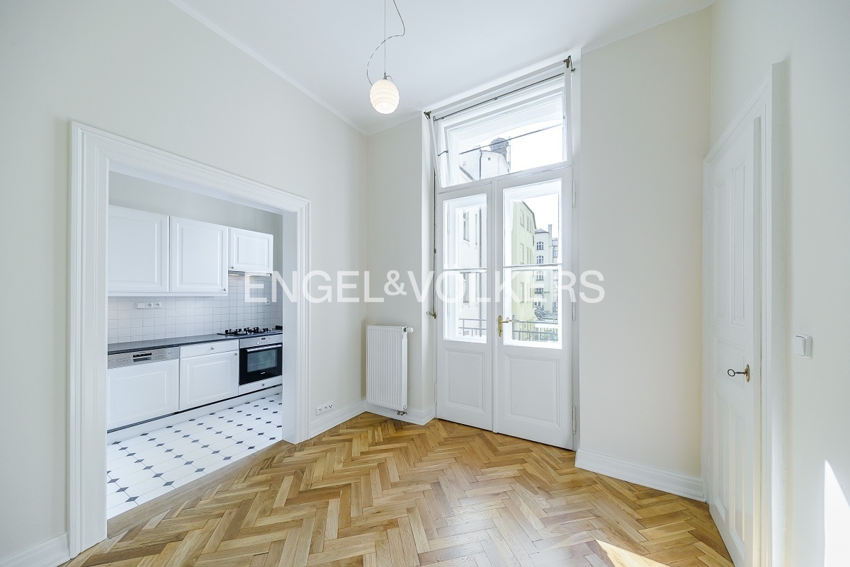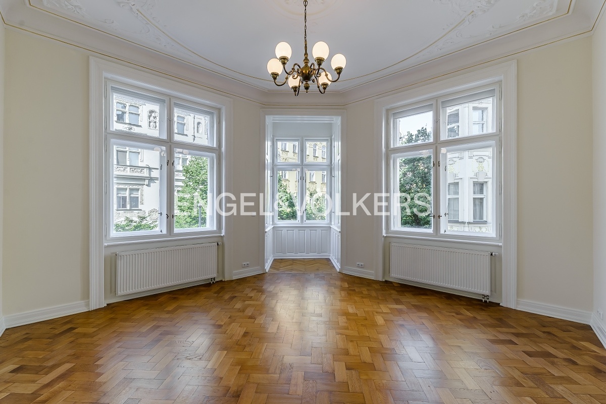 Spacious apartment at a very prestigious address is located on the 2nd floor of a historic Art Nouveau building with 24 / 7 reception and elevator. The apartment is after a complete renovation, during which care was taken to preserve the original elements such as wooden parquet, stucco, and wooden ceiling in the living room. The apartment offers a total of three bedrooms, a spacious living room, a dining room with a fully equipped kitchen with all appliances, a bathroom, and a separate toilet. Optical fiber internet connection via PE3ny net is available; 24h security is included in the rent.