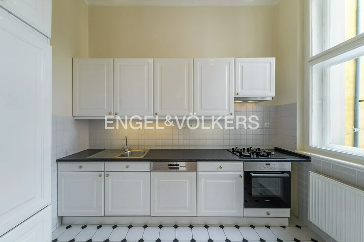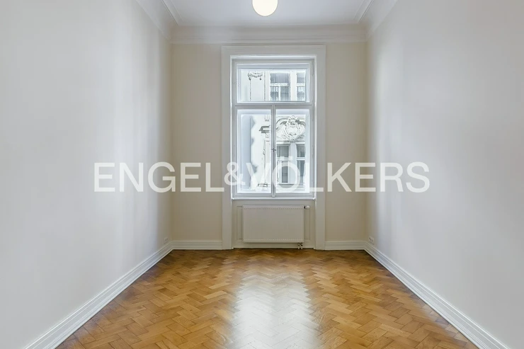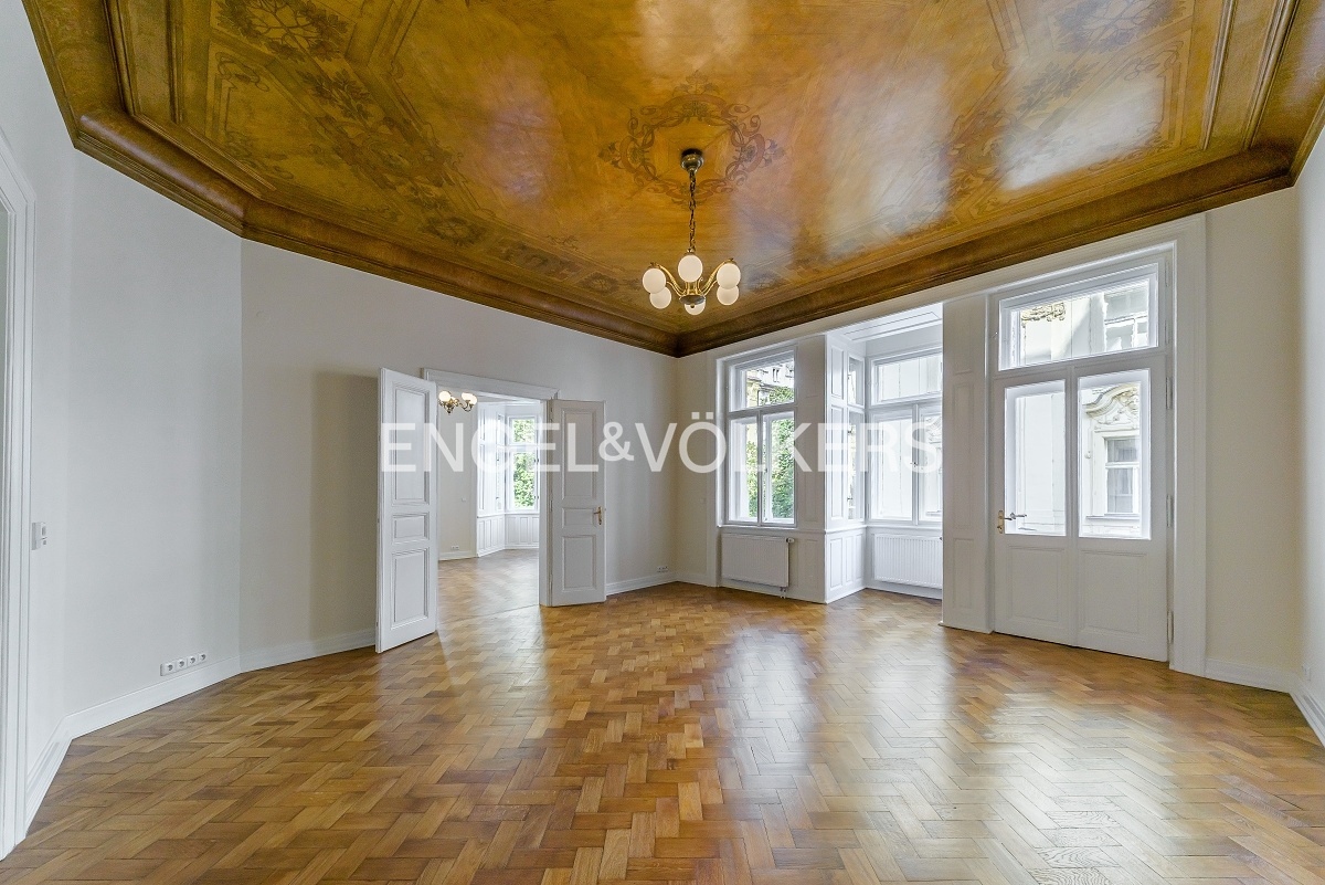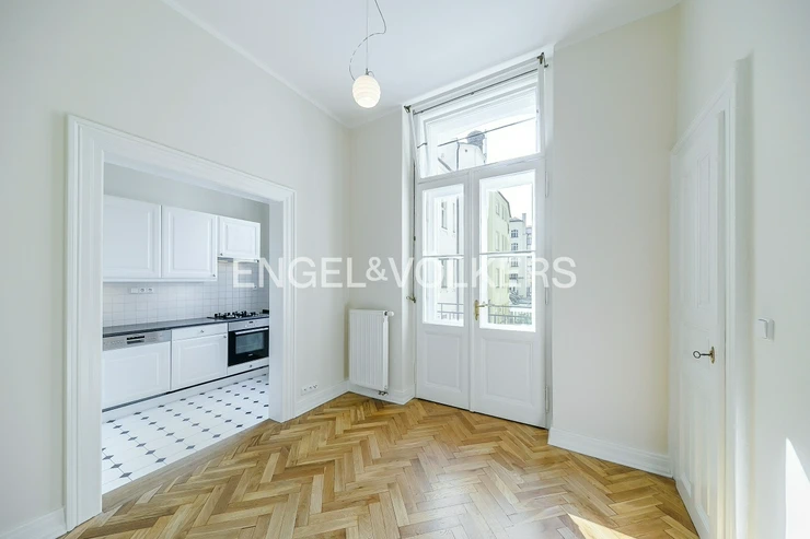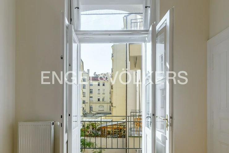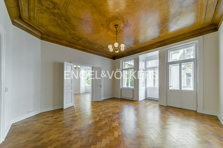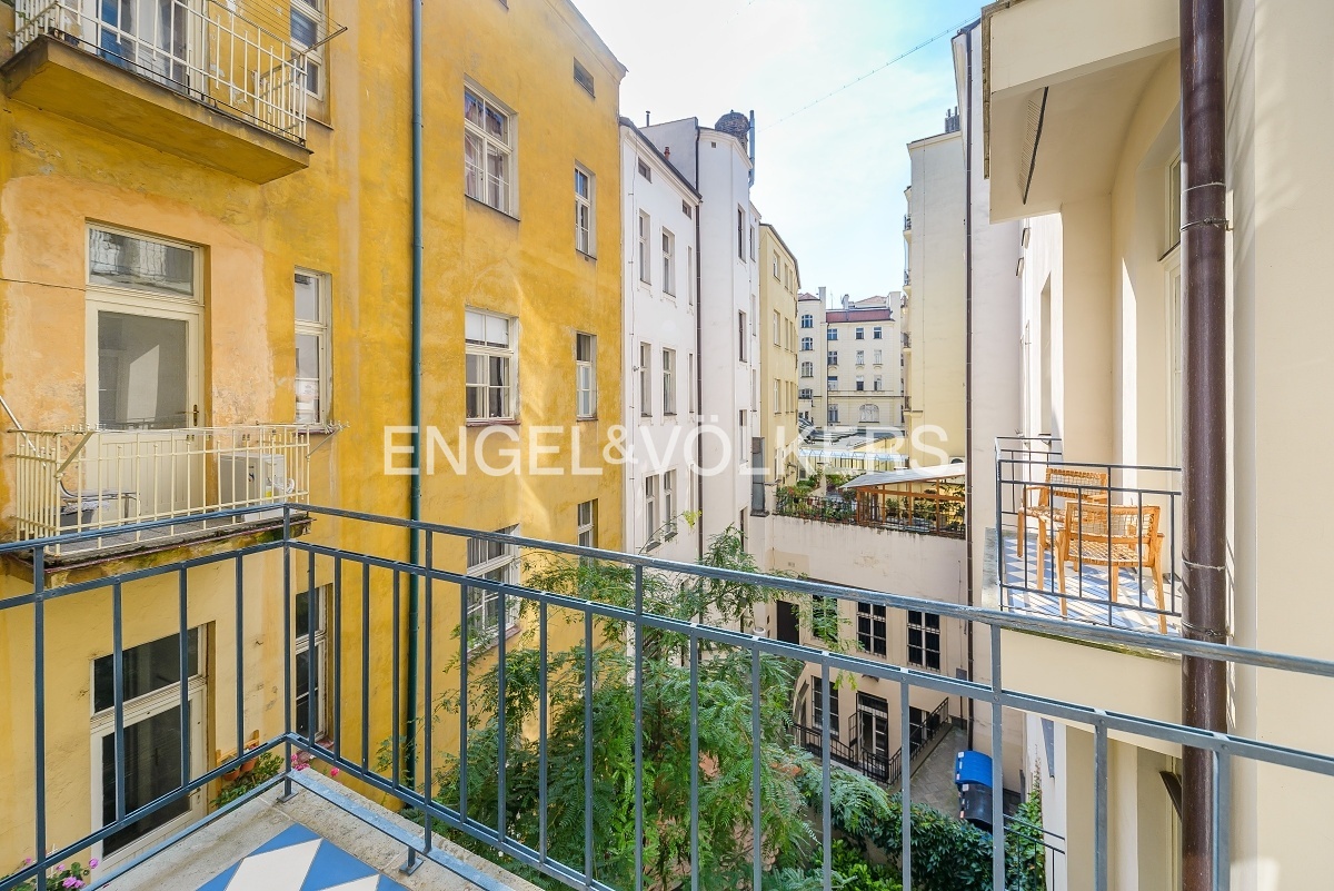 Spacious apartment at a very prestigious address is located on the 2nd floor of a historic Art Nouveau building with 24 / 7 reception and elevator. The apartment is after a complete renovation, during which care was taken to preserve the original elements such as wooden parquet, stucco, and wooden ceiling in the living room. The apartment offers a total of three bedrooms, a spacious living room, a dining room with a fully equipped kitchen with all appliances, a bathroom, and a separate toilet. Optical fiber internet connection via PE3ny net is available; 24h security is included in the rent.