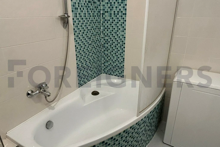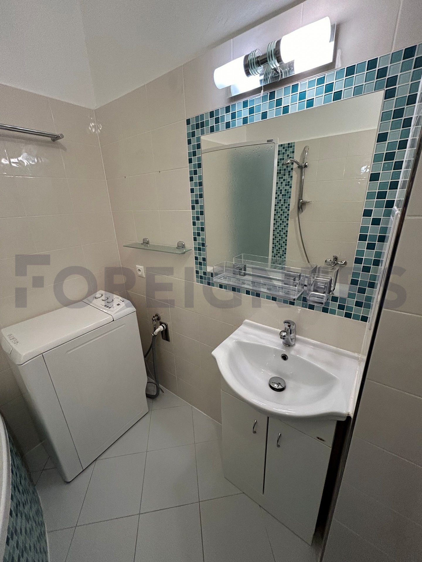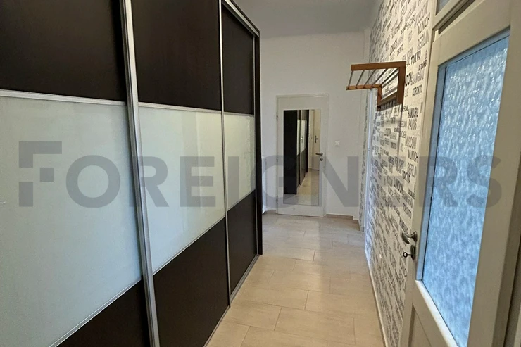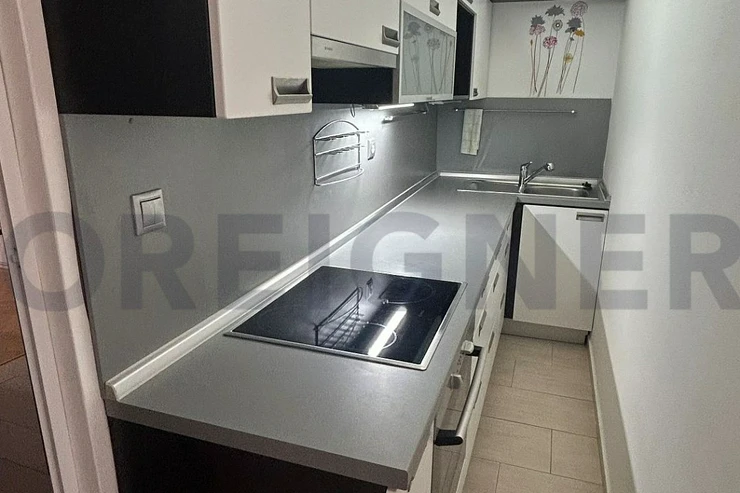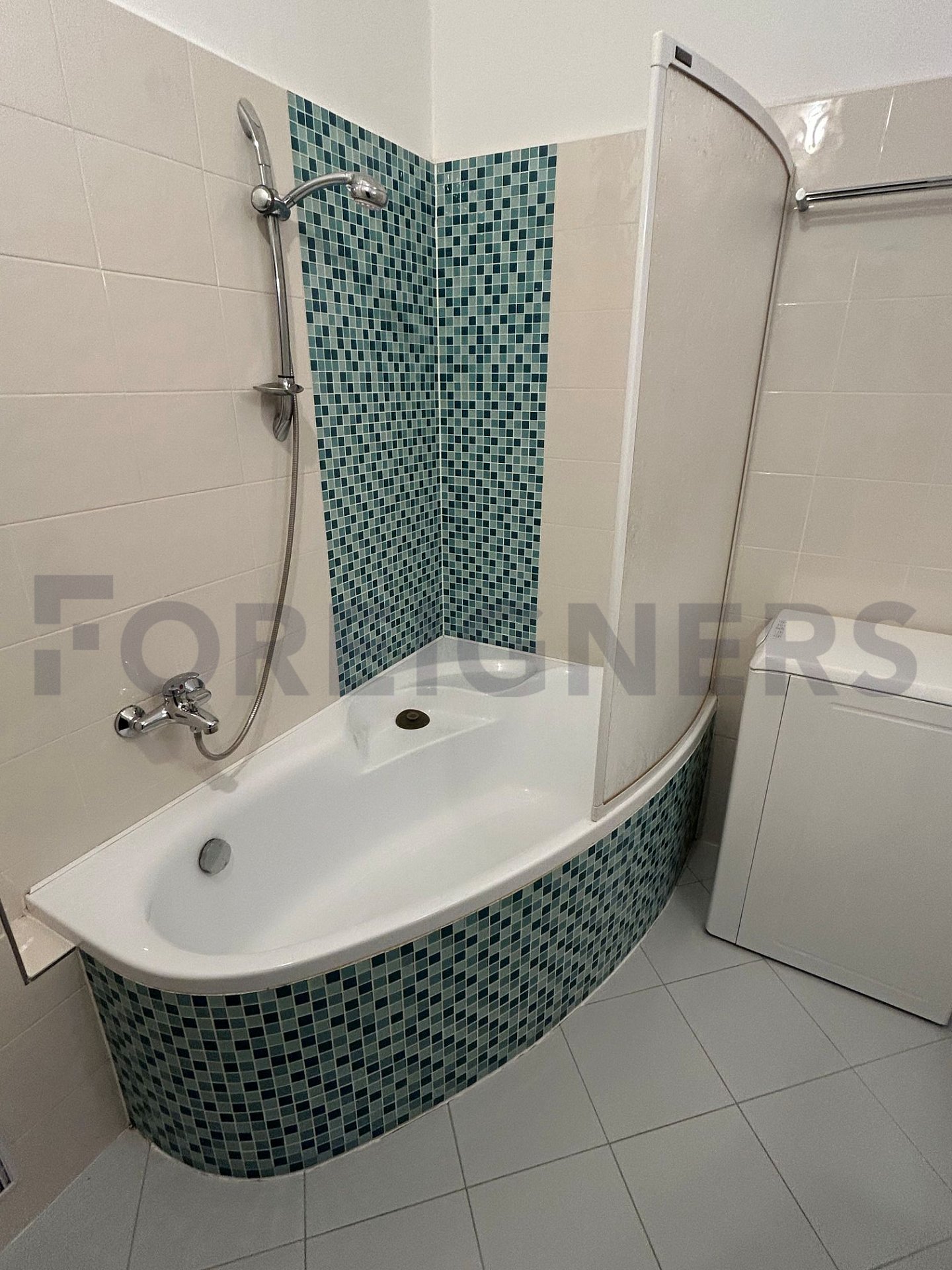 This apartment is offered as semi- furnished. In the hallway you can find large in-built wardrobe, bathroom has a corrner bathtub, sink with mirror and place for washing machine. Living room area is empty and ready for your decoration. Kitchen inlcudes fridge with freezer, microwave oven, glas-ceramic stove with electric oven and sink. Dining area and bedroom remains unfurnished.