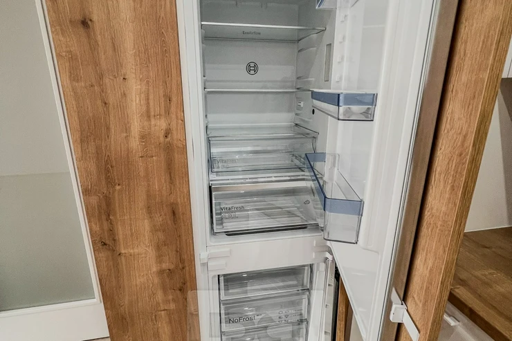 Layout: entrance hall with access to all rooms – a living room with a fully equipped kitchen and access to a balcony overlooking a शांत and green courtyard. The kitchen is fitted with an induction hob, extractor hood, electric oven, microwave, dishwasher, and fridge with freezer. From the hallway with a built-in wardrobe, there is access to two bedrooms (one of them also has access to the balcony), a bathroom with a bathtub and toilet, a separate toilet with a sink, and an additional room suitable as a walk-in closet or storage.