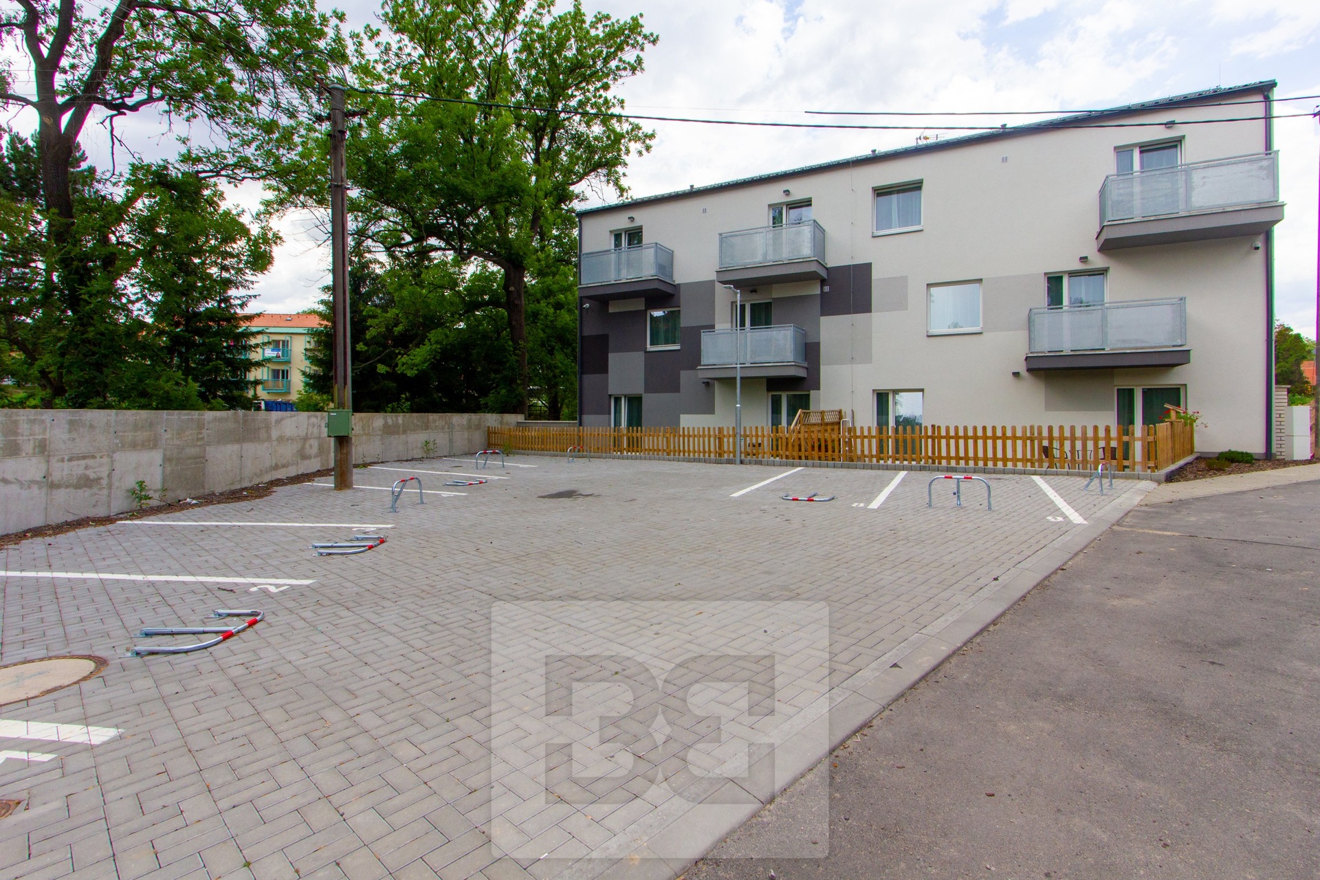 The building is located in a green area near the Únětický stream. A children’s playground is situated in front of the building, and nearby bus stops (U Dvora and Ke Kopanině) provide excellent connections to Prague (approx. 19 minutes to Metro Line A – Nádraží Veleslavín). The location is ideal especially for those working at the airport or seeking quiet living close to Prague.