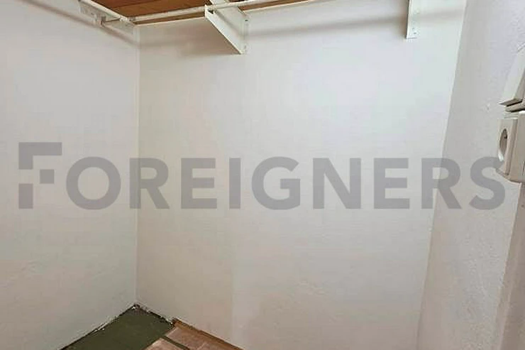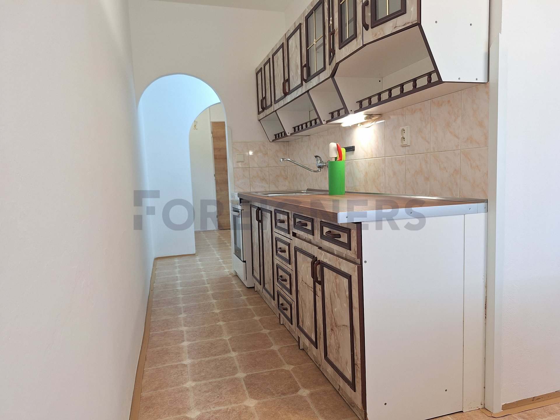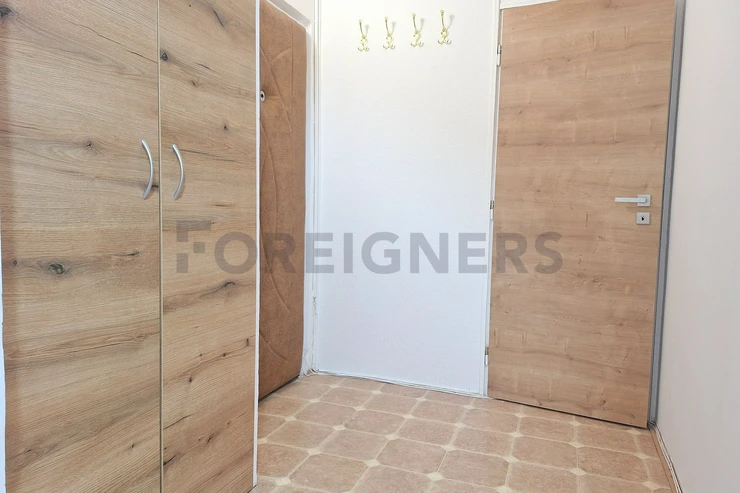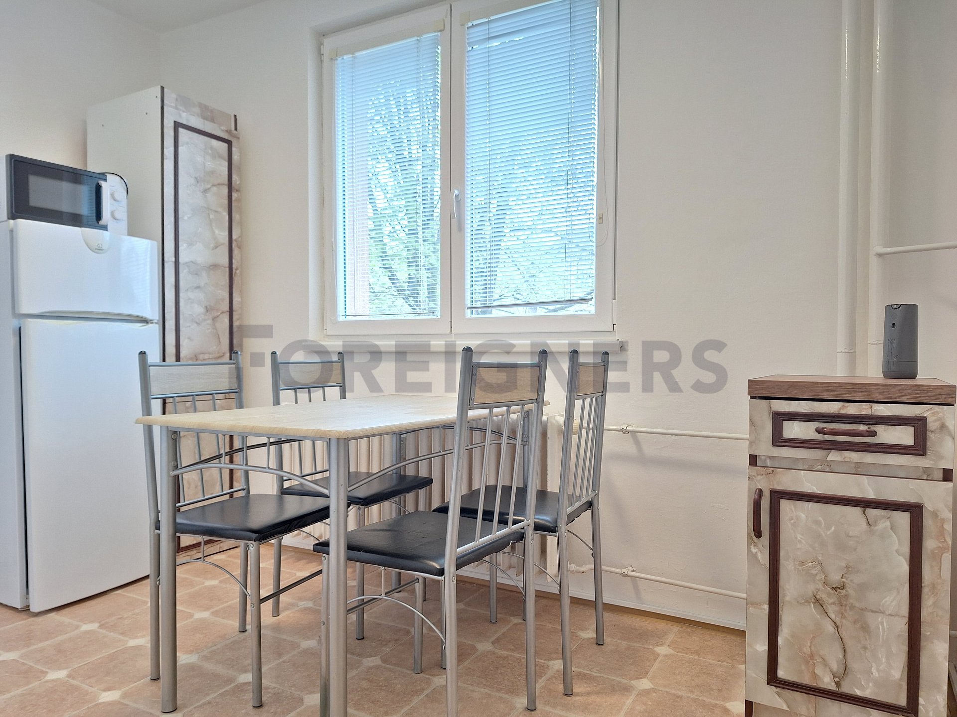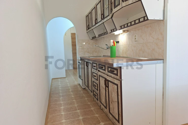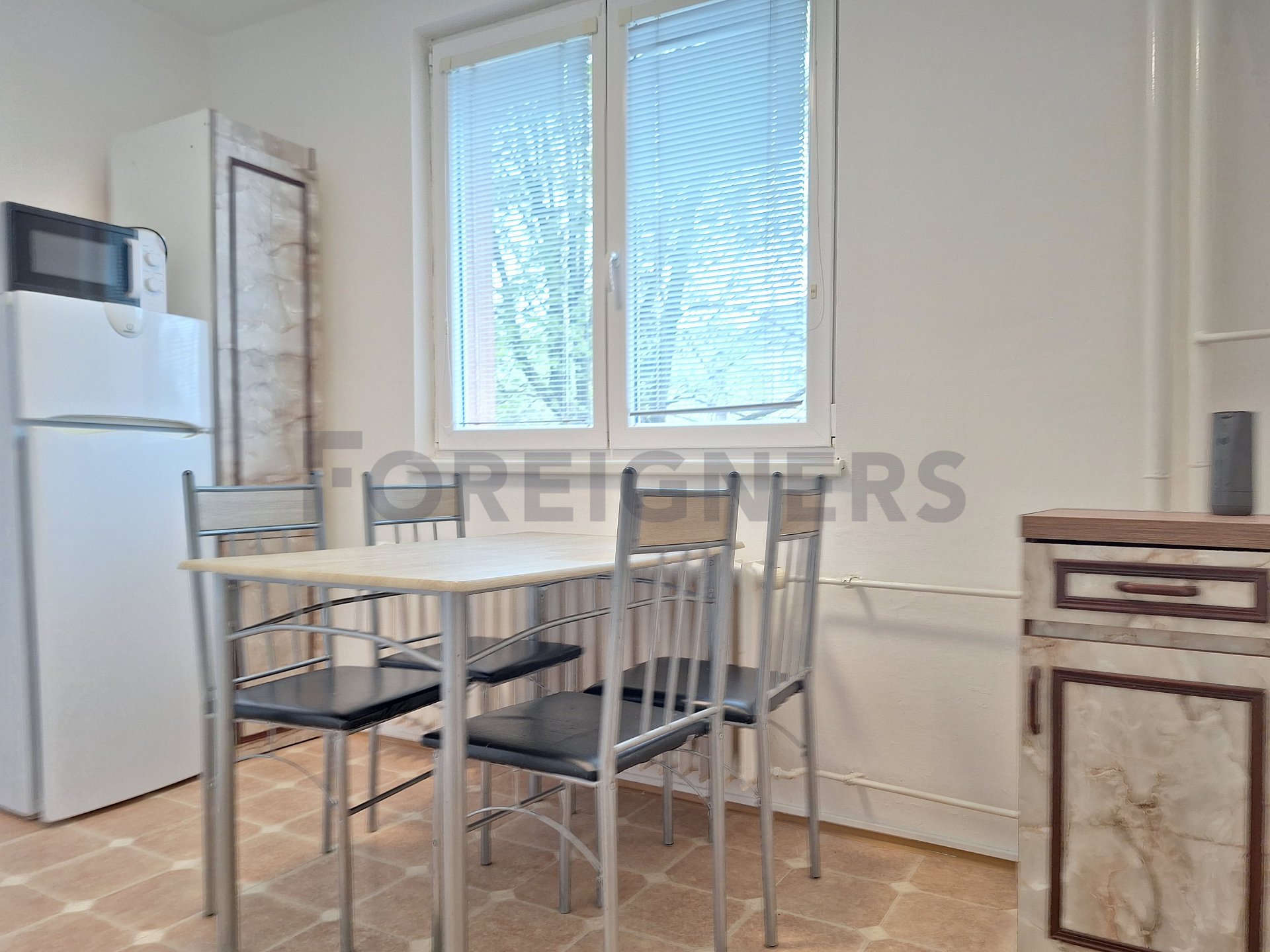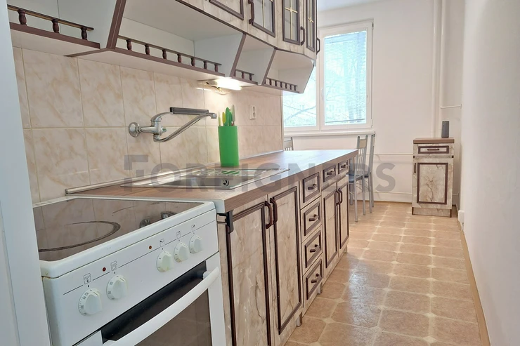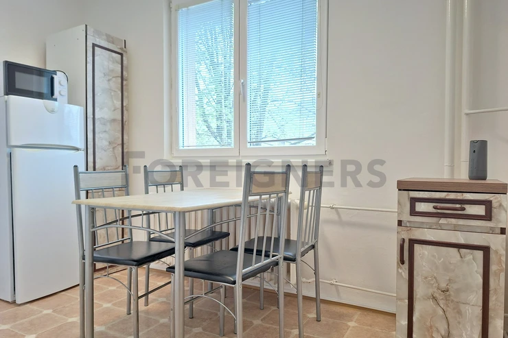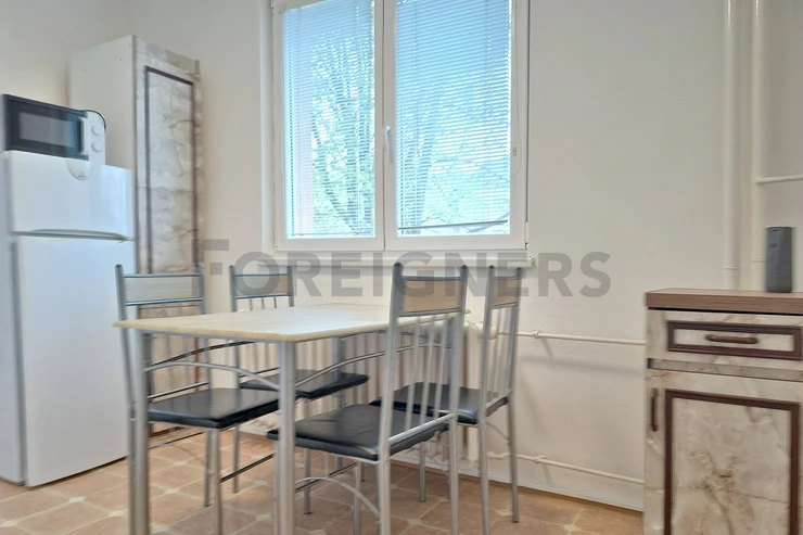The apartment is offered partly furnished. The kitchen unit includes electric hub with oven and a frigde with a freezer. There is also a table with 3 chairs.