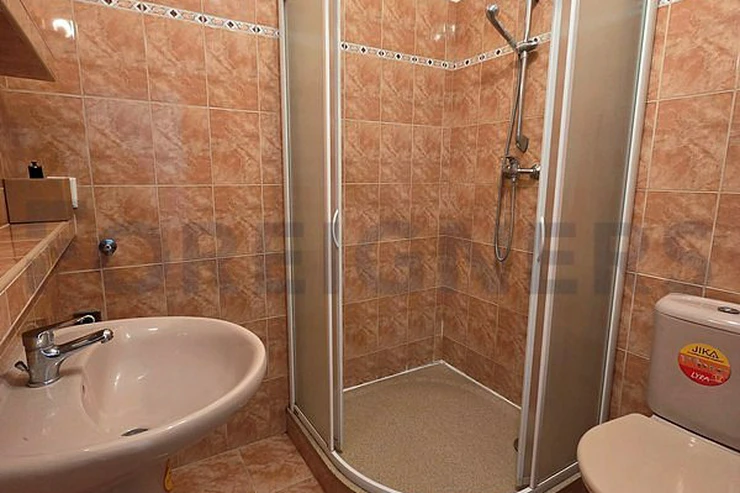 In the bathroom there is a shower, a wash-basin and a toilet.