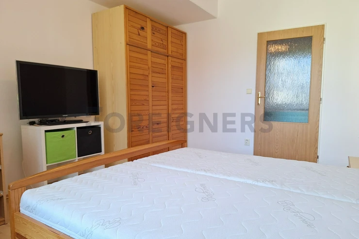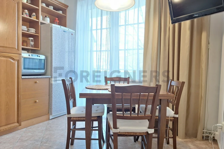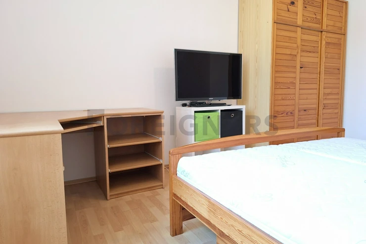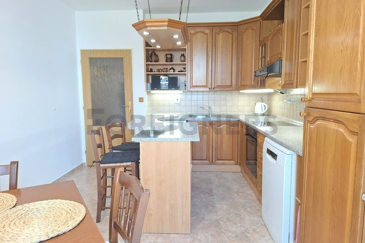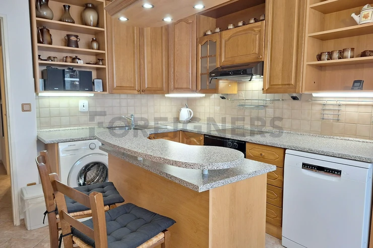 The apartment is offered furnished. The stylish kitchen has all appliances - refrigerator, electric oven, microwave oven, dishwasher, washing machine, hob and hood. In the kitchen you will also find a dining table with chairs and a television. There is an access to a balcony.