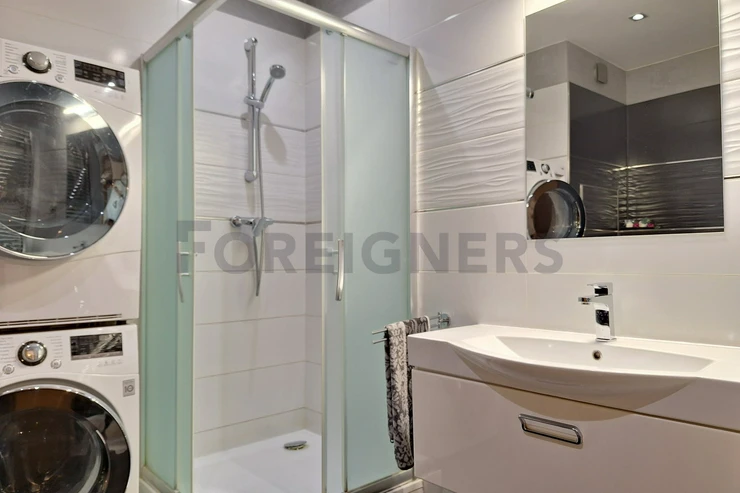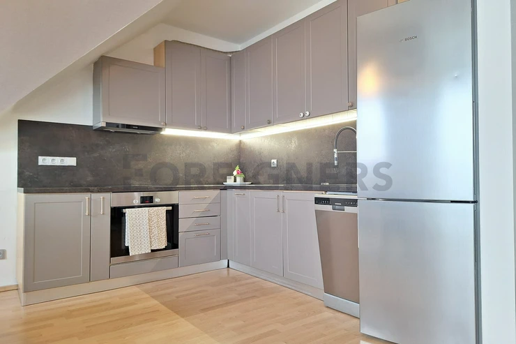 The apartment is offered fully furnished. The stylish kitchen has all appliances - fridge, dishwasher, electric oven, hob and hood. In the kitchen you will also find a dining table with four chairs.
