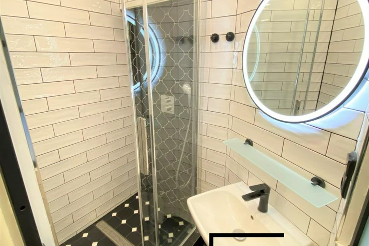 The spacious kitchen with dining room is equipped with a dishwasher, washing machine, oven, stove and fridge with freezer. The room accessible from the kitchen is dominated by stained glass windows and a sleeping floor. The room is equipped with a wardrobe, a bed with a chest of drawers, a sofa and a desk. The bathroom is equipped with a shower, the toilet is separate. All windows face the courtyard.