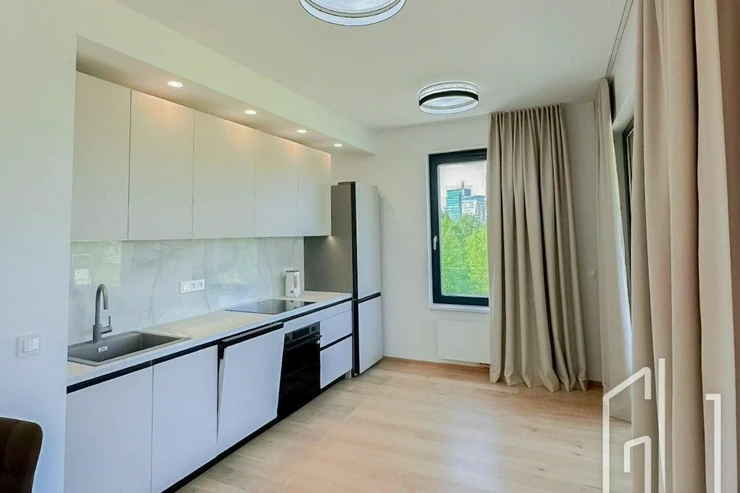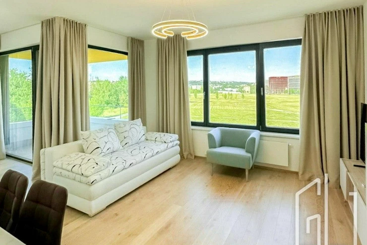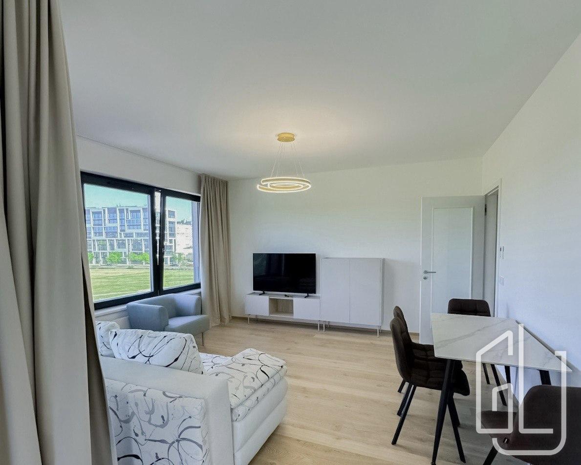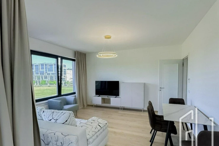 The apartment is fully furnished and offers modern, comfortable living in a new building. The kitchen is equipped with all appliances. The spacious living room includes a TV, sofa, dining table, and chairs, with direct access to the balcony.