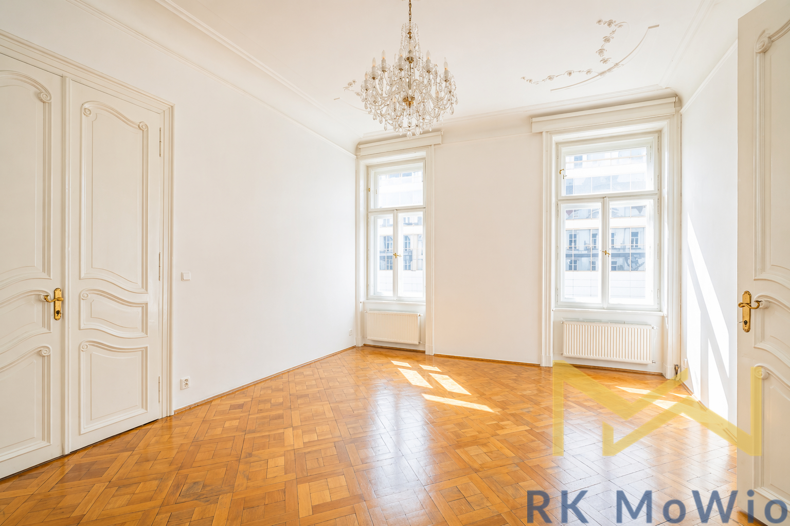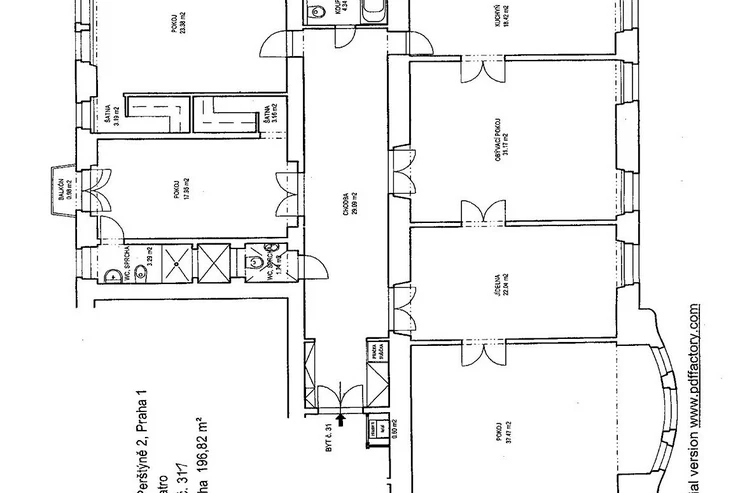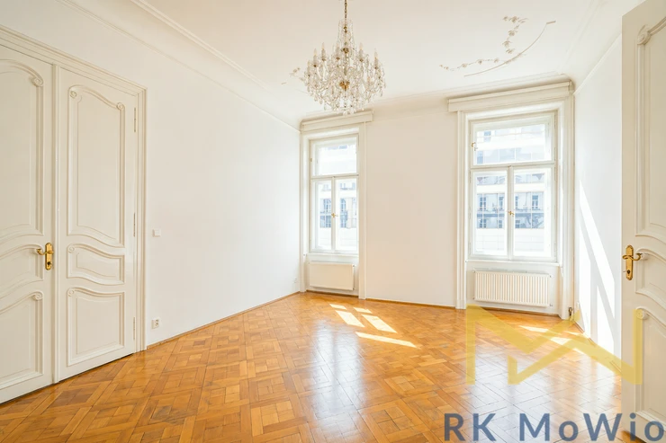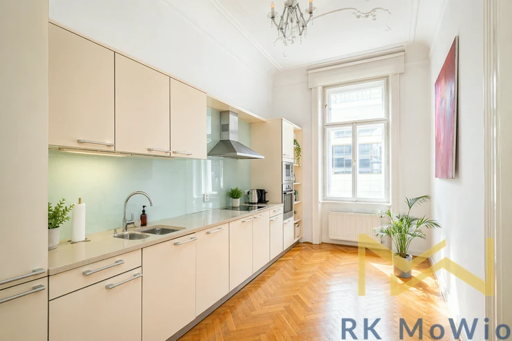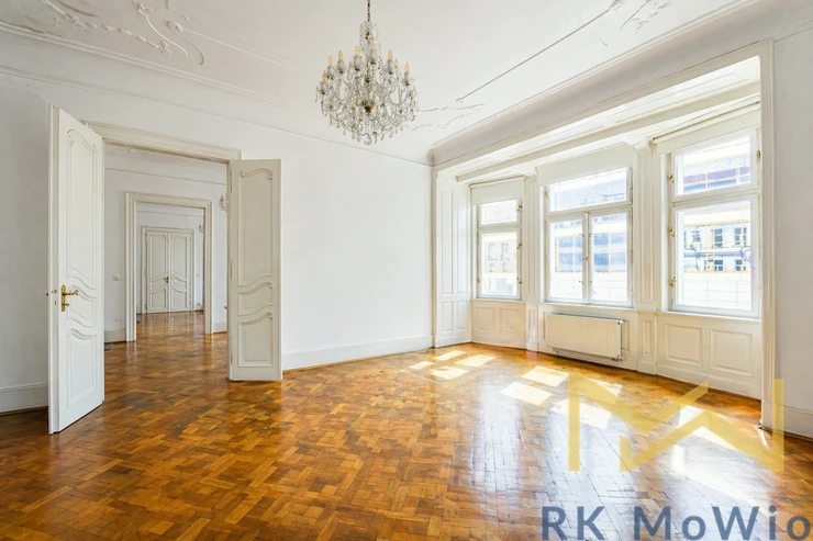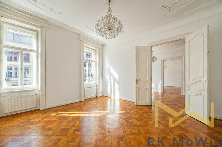 We offer for rent a bright and spacious unfurnished 4-bedroom apartment (5+1) with a total area of 197 sqm and a small balcony, situated on the 3rd floor (4th above-ground floor) of a renovated Art Nouveau building with an elevator in the attractive location of Prague 1 – Nové Město, on Na Perštýně Street. The apartment offers representative living in the very center of Prague with the unique atmosphere of historic architecture and excellent access to all amenities.