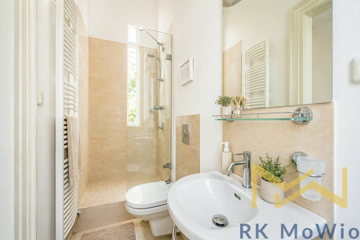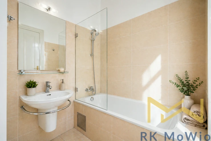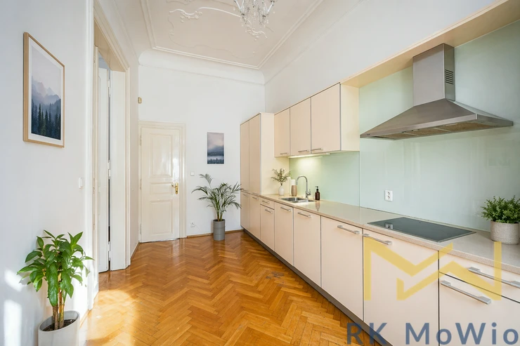 The layout consists of a spacious entrance hall, living room, проход-through dining room or study, fully equipped kitchen, master bedroom with a walk-in closet, private balcony, and en-suite bathroom (shower, toilet), two additional bedrooms (one with a walk-in closet), a second bathroom (bathtub, toilet, bidet), and a separate toilet. The layout provides a comfortable separation of living and private areas and offers ample space even for demanding clients. The apartment features a fully equipped kitchen (ceramic hob, oven, dishwasher, fridge with freezer, microwave), high stucco ceilings, large windows, parquet floors, tiles, and a gas boiler. The interior is elegant, airy, and preserves its classic city character.