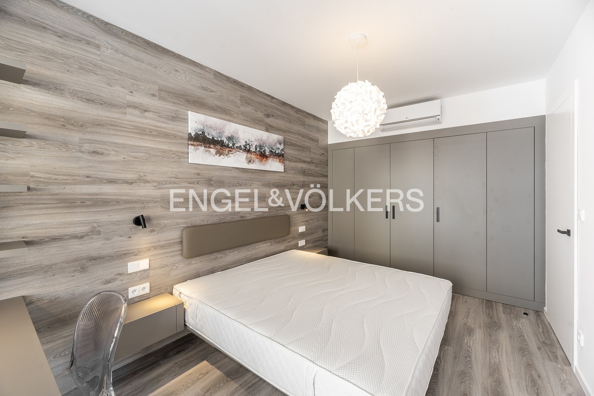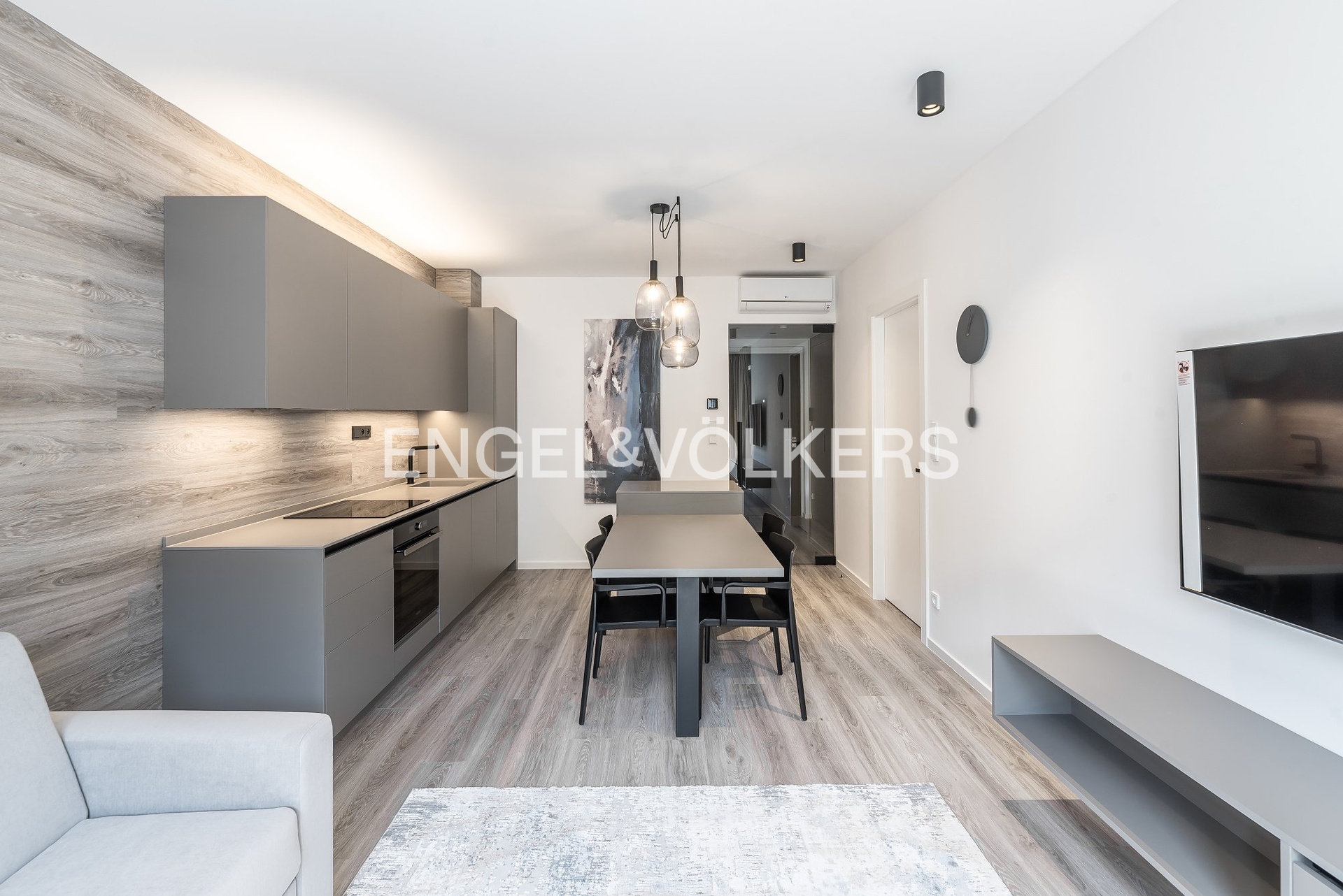 The layout of the apartment includes an entrance hall with a built-in wardrobe, a spacious living room with a fully equipped kitchenette, a dining area and direct access to the balcony, a bedroom equipped with built-in wardrobes, and a bathroom featuring a bathtub, toilet, and washing machine. The apartment is fully furnished, including a sofa bed, curtains, an LED TV, and a combined washer-dryer. Comfort is enhanced by air conditioning in all main rooms.