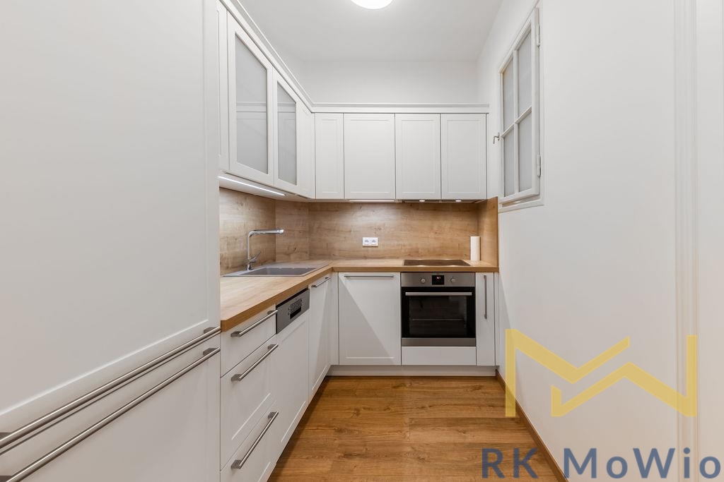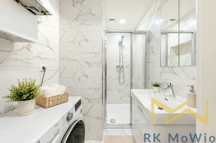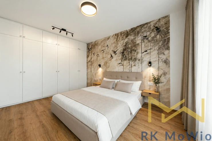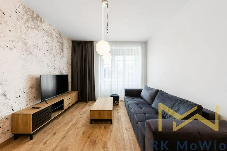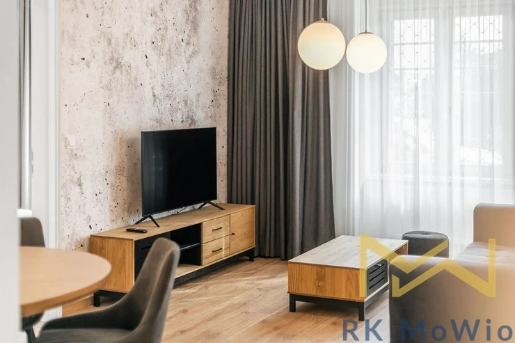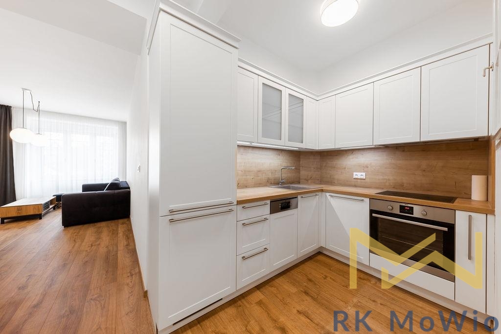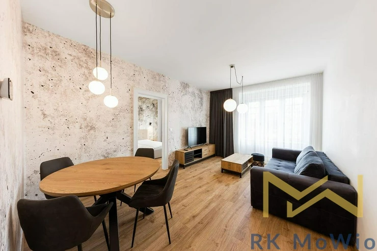 The layout consists of an entrance hall, an airy living room with a kitchen, one bedroom with built-in wardrobes, a bathroom (shower, washbasin), and a separate toilet. The interior is elegantly furnished and provides comfortable living without the need for further investment. The apartment features a fully equipped kitchen (fridge with freezer, ceramic hob, oven, dishwasher, extractor hood), built-in wardrobes, a washing machine, curtains and blackout drapes, high-speed internet connection, wooden floors, and tiles. A storage unit is included.