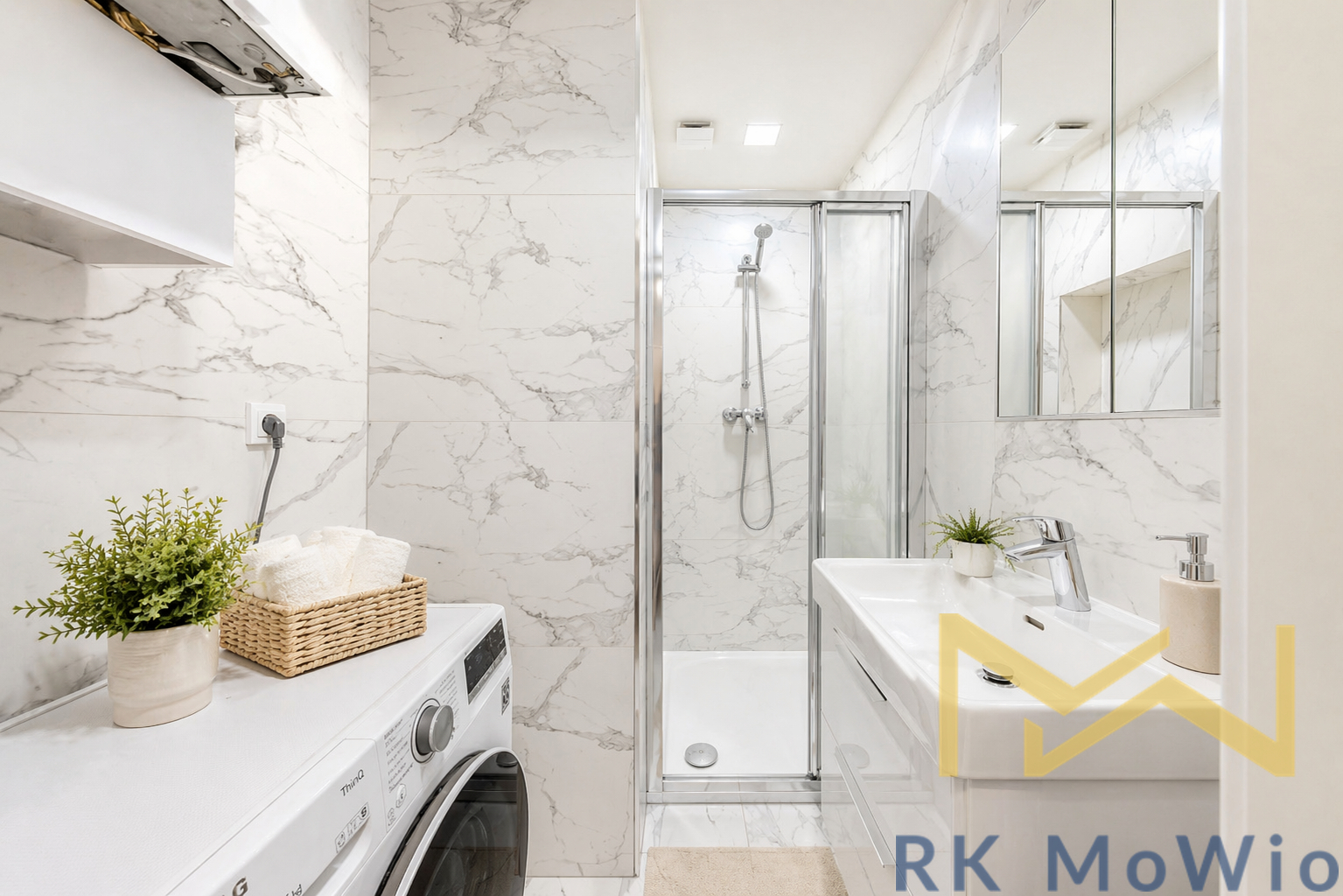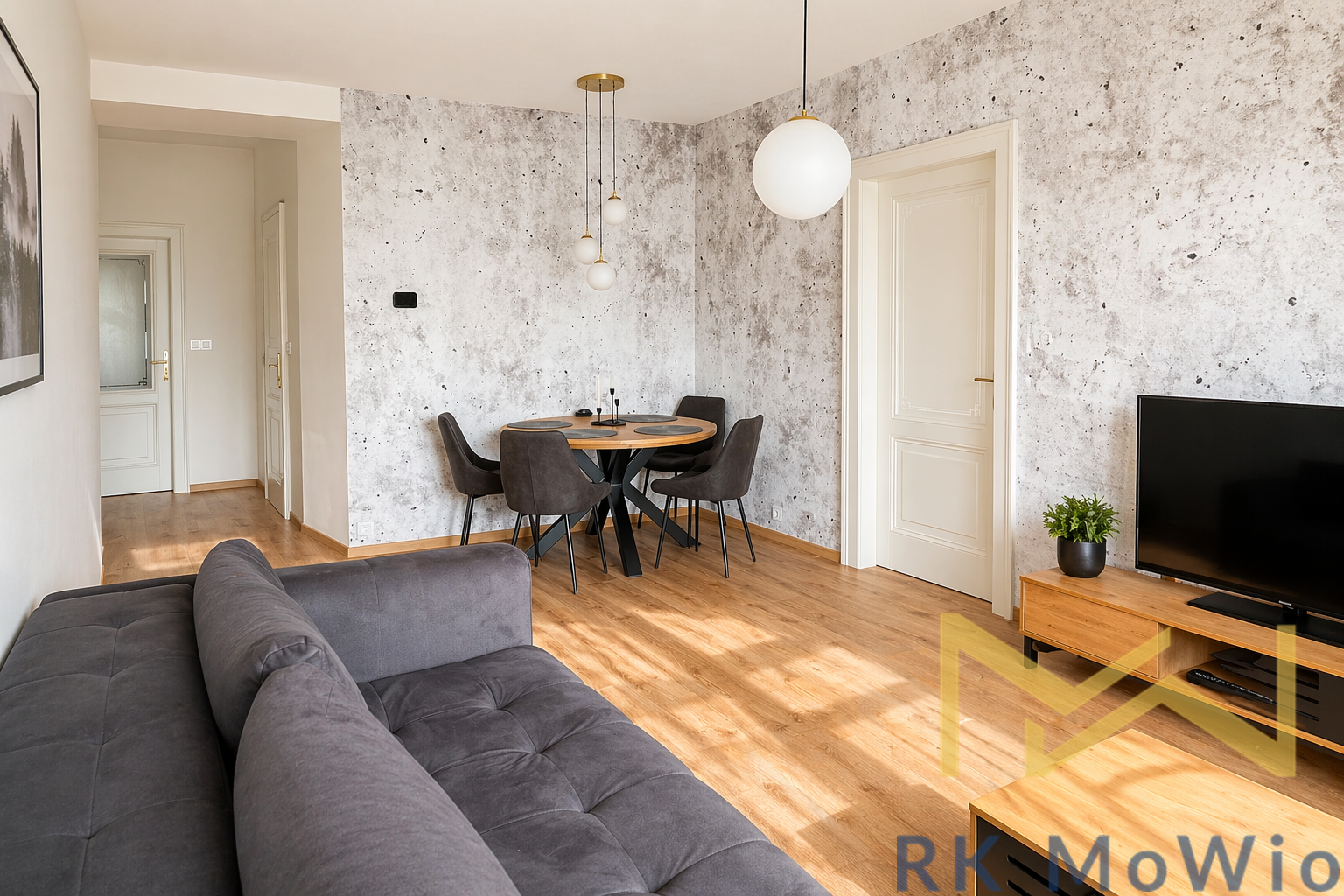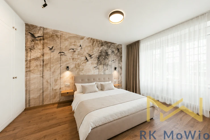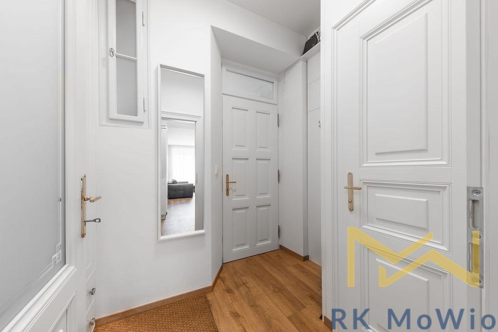 The layout consists of an entrance hall, an airy living room with a kitchen, one bedroom with built-in wardrobes, a bathroom (shower, washbasin), and a separate toilet. The interior is elegantly furnished and provides comfortable living without the need for further investment. The apartment features a fully equipped kitchen (fridge with freezer, ceramic hob, oven, dishwasher, extractor hood), built-in wardrobes, a washing machine, curtains and blackout drapes, high-speed internet connection, wooden floors, and tiles. A storage unit is included.
