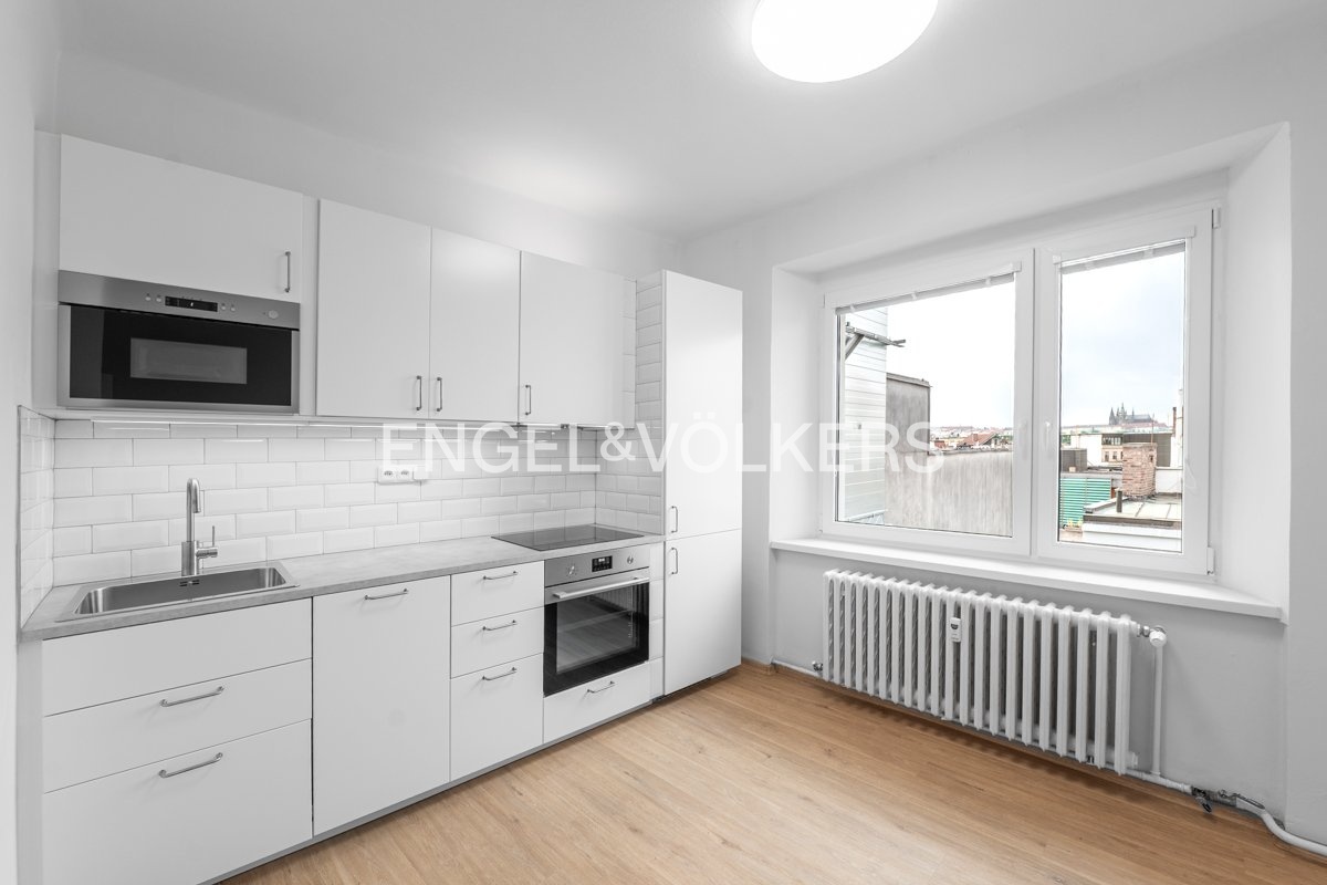 Kitchen equipped with all appliances with a view of Prague Castle