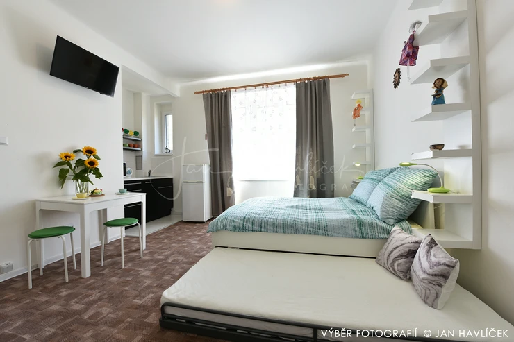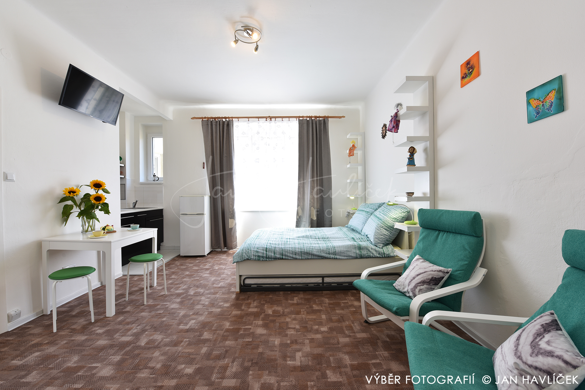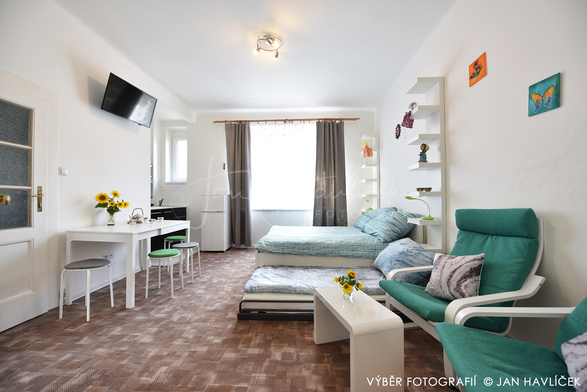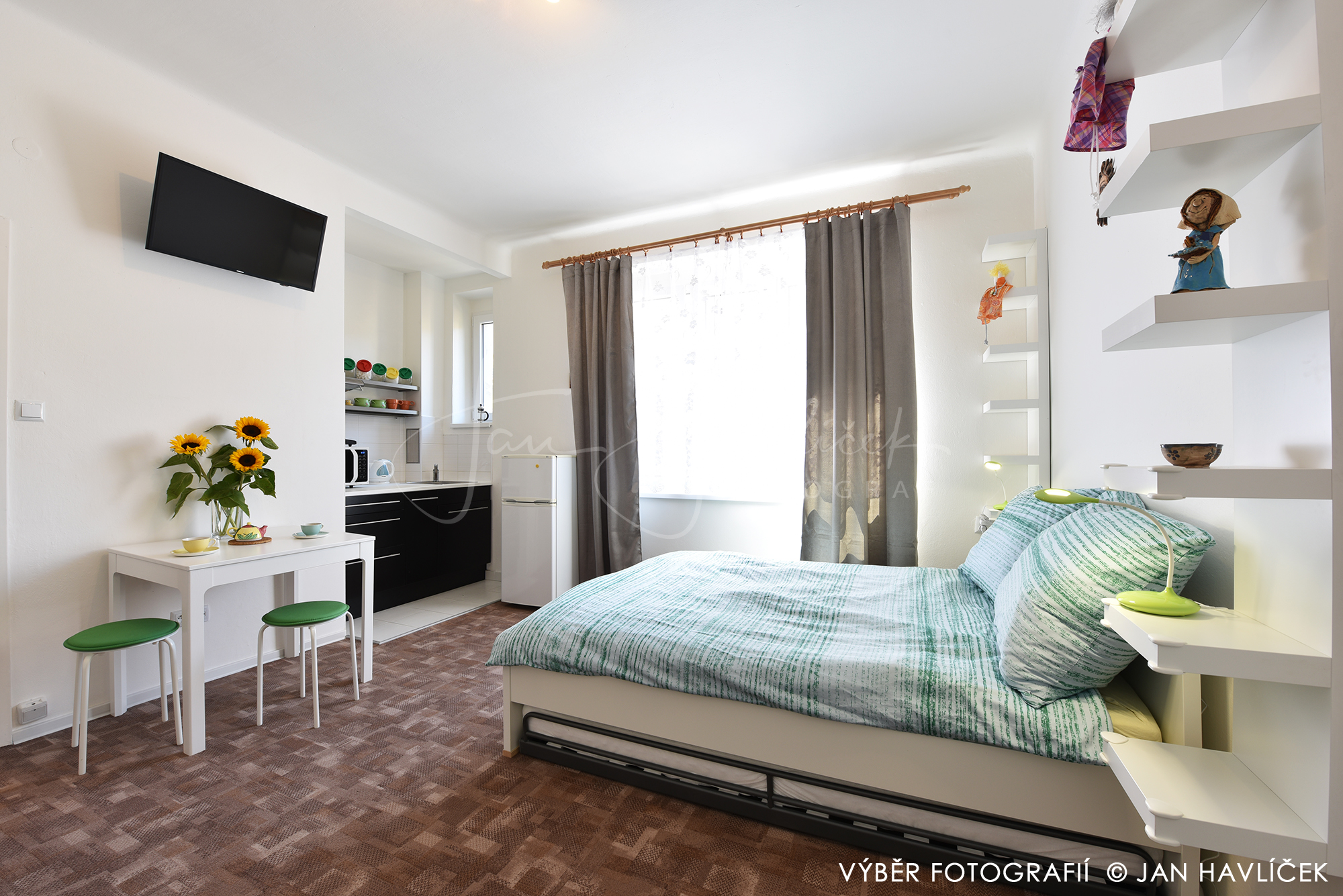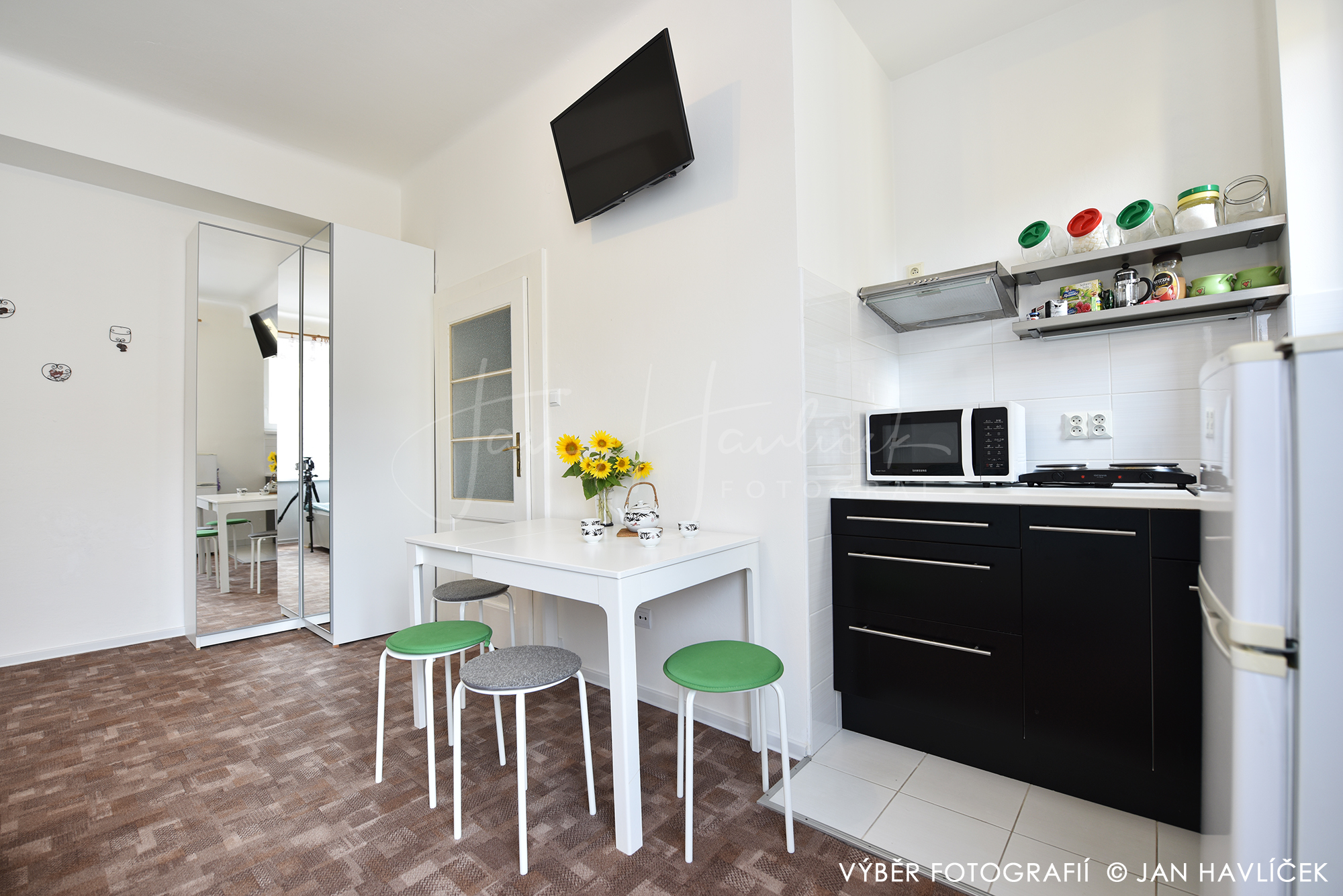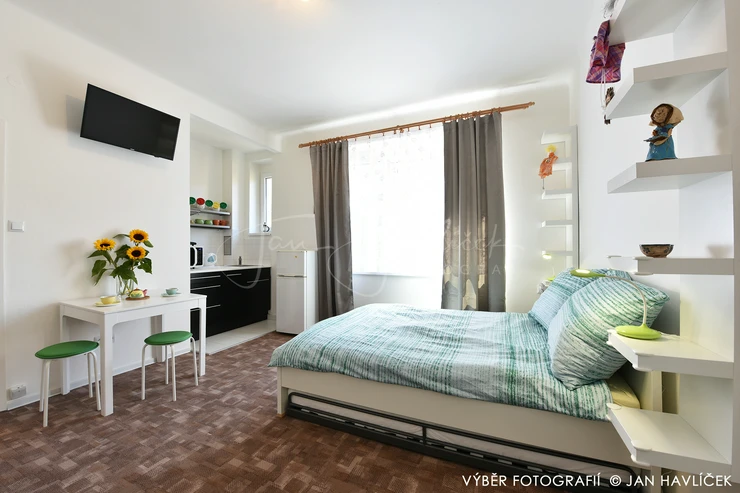 Bright and quiet, fully equipped 1-room apartment with kitchenette, 30 m², in the attractive Prague-Libeň area, just 4 minutes’ walk from Palmovka metro station.