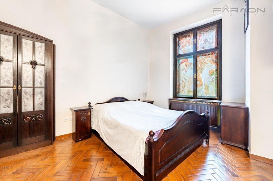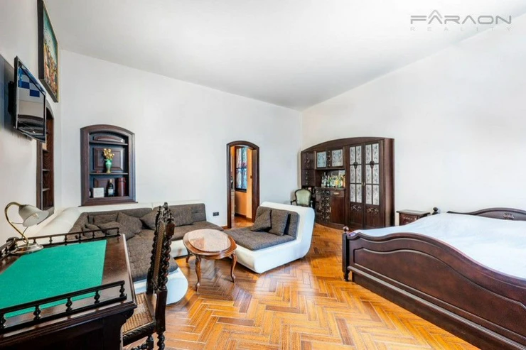 Equipment includes: washing machine, refrigerator with freezer, hob, microwave, coffee maker, TV, intercom, security door and all furniture shown in the photo documentation. The apartment has preserved the original tiles with parquet decor, doors, gas boiler.