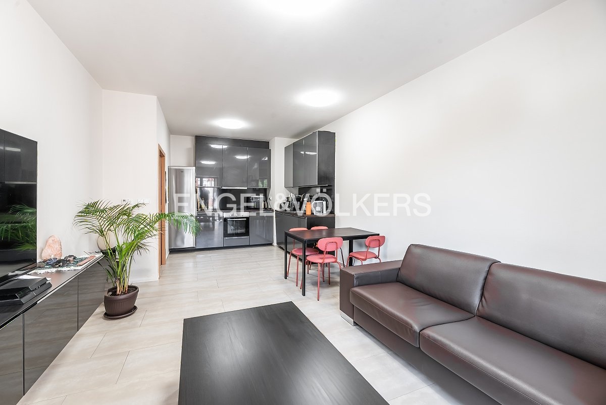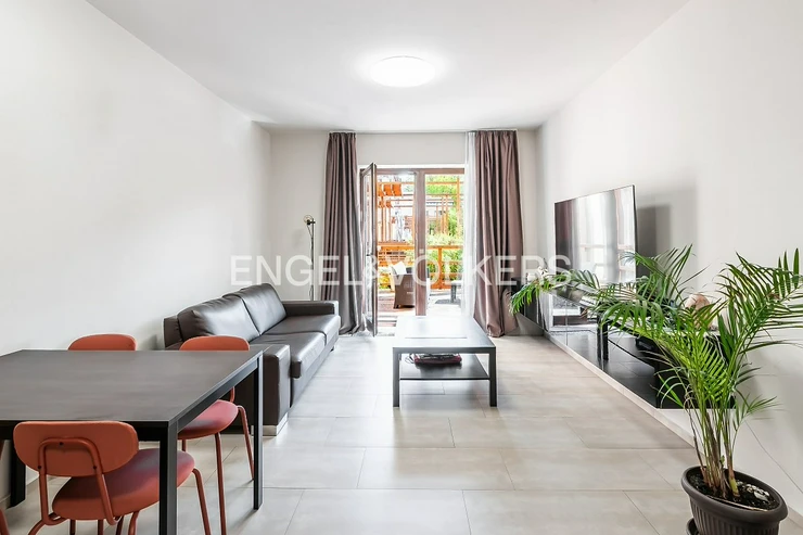 The apartment features an entrance hall, a bathroom equipped with a shower, washing machine, and dryer, a separate bedroom, and a spacious living room combined with a fully equipped kitchen with all appliances. Both the bedroom and the living room provide access to a private terrace, which is situated in a quiet courtyard accessible only to the building's residents.