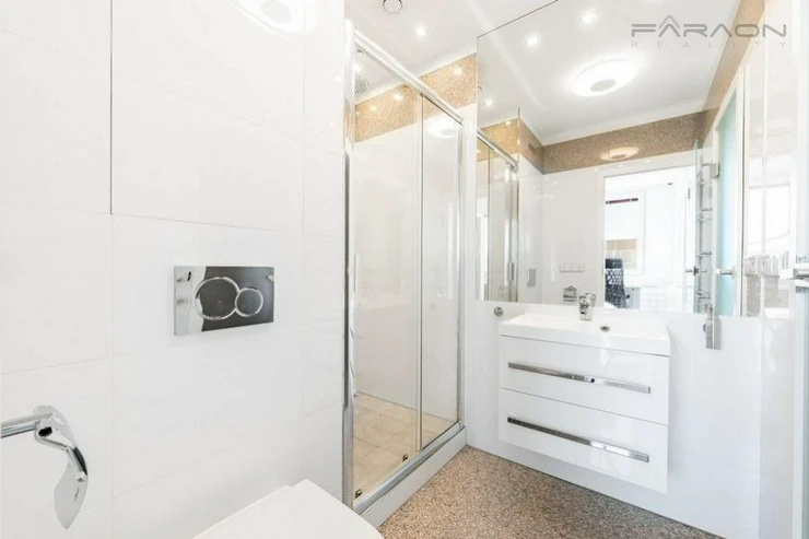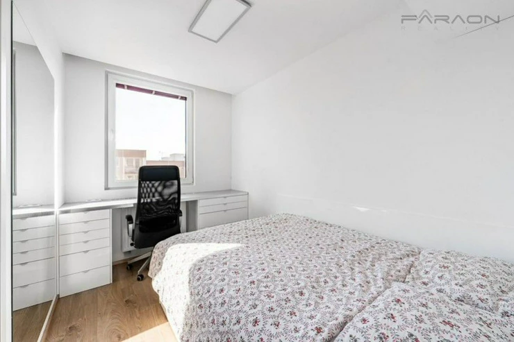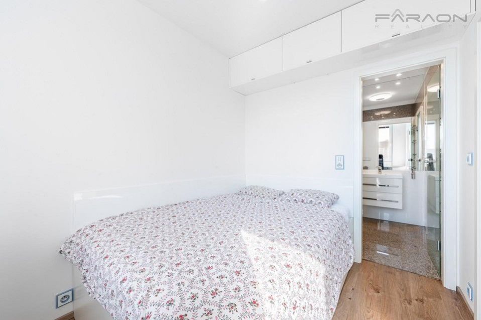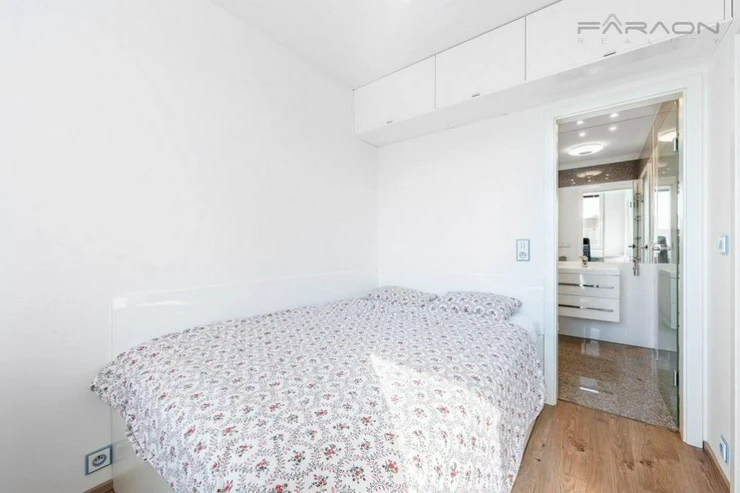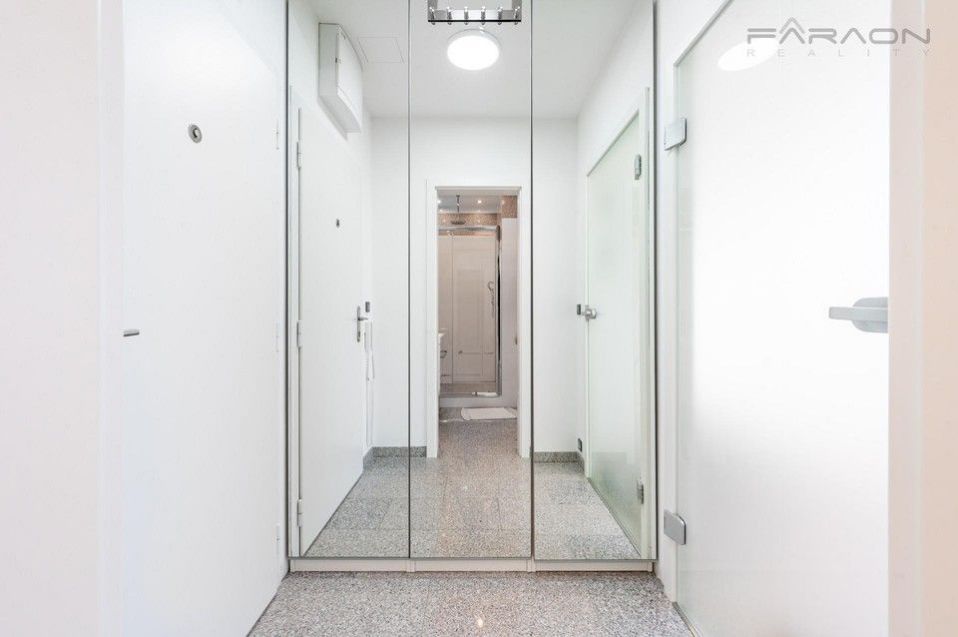 The layout consists of a living room with a fully equipped kitchenette (dishwasher, oven, microwave, induction hob, extractor hood, refrigerator, washing machine with dryer), a bedroom with a double bed and a work area, a bathroom with a shower and toilet and a hallway. The apartment is designed with an emphasis on maximum comfort, functionality and plenty of storage space. The apartment includes split air conditioning and ambient LED lighting. The apartment includes a cellar.