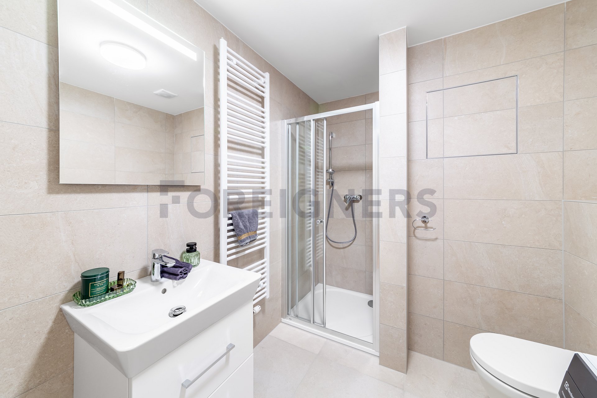Bathroom with modern shower, including washbasin cabinet, backlit mirror, toilet and Electrolux washing machine.