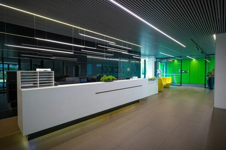 Technical specifications: double floors with floor electrical boxes including sockets, white painting, air conditioning system, suspended ceilings with installed lighting, opening windows, preparation of connection points for the kitchen unit, connection points for data and telephone cables, external window blinds, elevator and reception.
