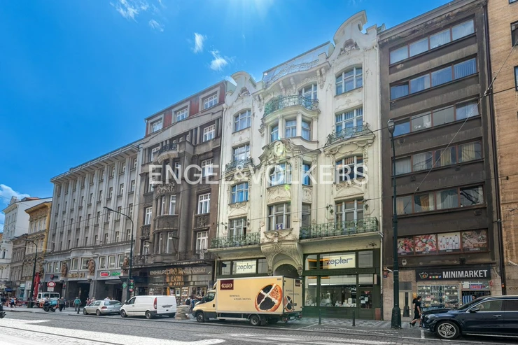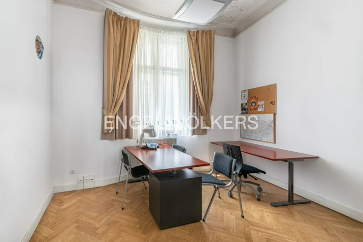 This separate office with an area of 169 m² is located in an apartment building right next to the Národní Třída metro station in an attractive part of Prague's New Town. Access is from the building's passageway, and there is a reception desk on the ground floor (open weekdays from 9:00 a.m. to 5:00 p.m.). The premises are wheelchair accessible, with an elevator, parquet floors, and double wooden windows. A functional fireplace adds to the pleasant atmosphere. There is a separate kitchenette, separate toilets, a server room, and a camera system.