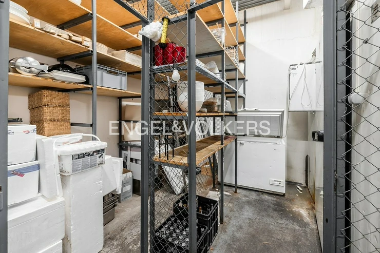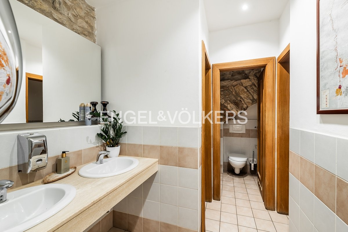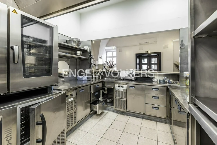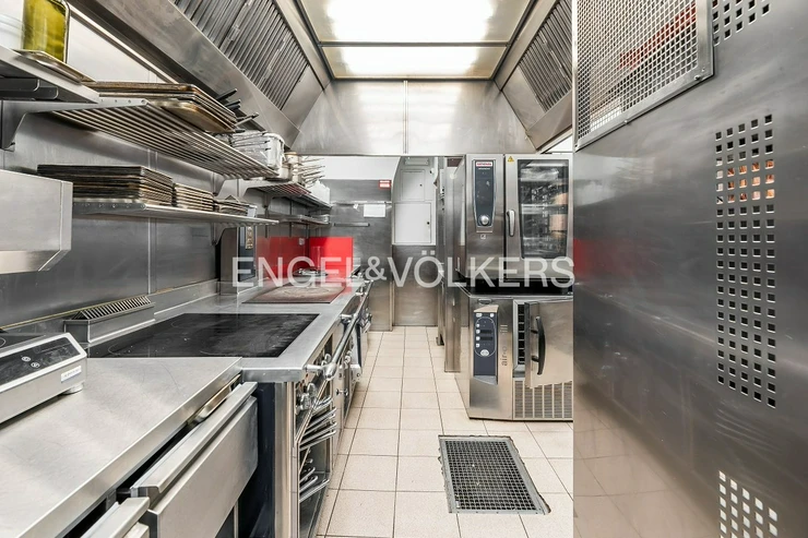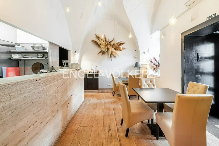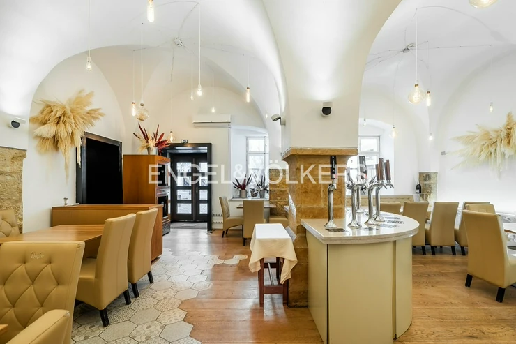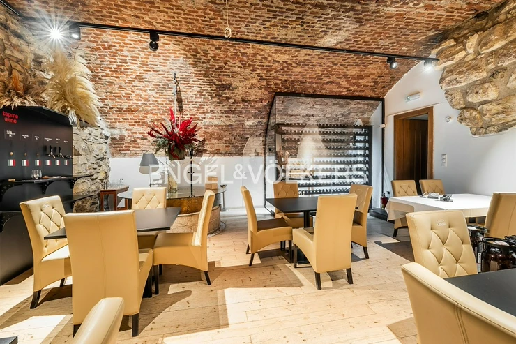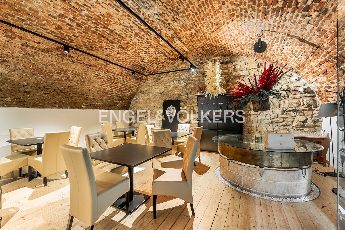 A wooden staircase connects the two floors, while the storage room can also be accessed by a lift. Separate toilets for guests provide comfortable facilities. The restaurant has the option of an outdoor garden measuring 6 x 6 m and is equipped with a CCTV system that also covers the outside areas. This unique space offers ideal conditions for running a luxury restaurant, wine bar or other gastronomic concept. It is rented with complete equipment. For more information, contact the broker.