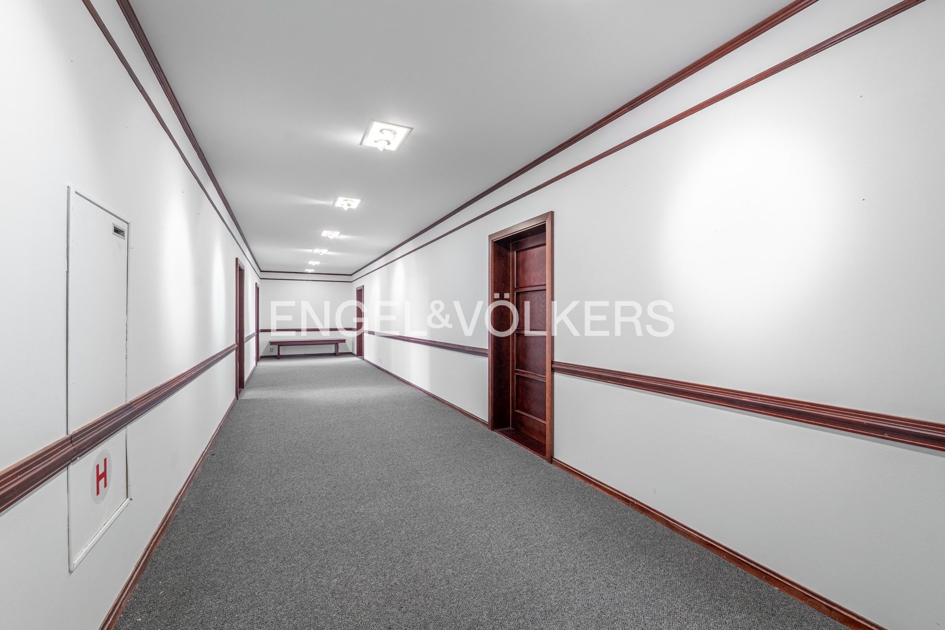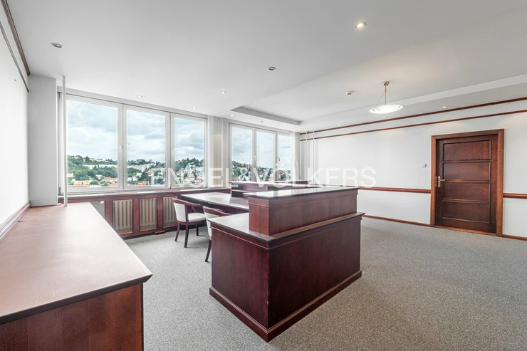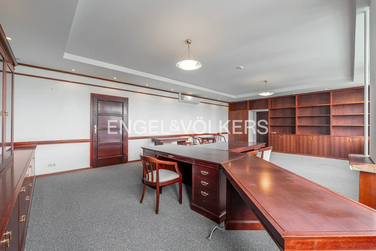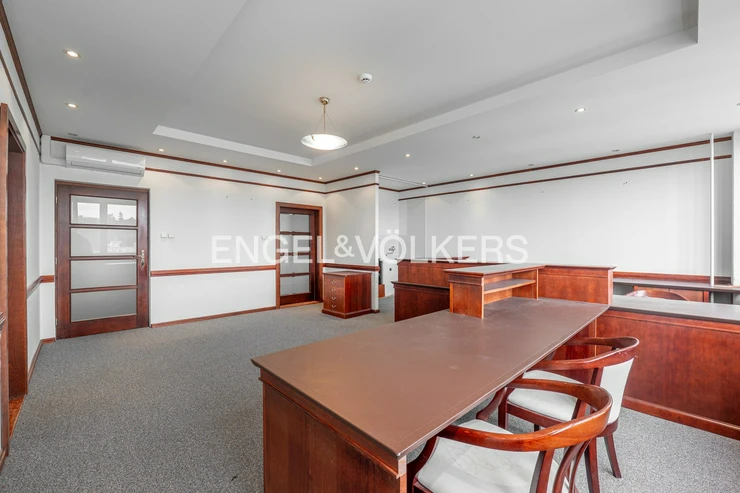 The interior of the space is finished to a high standard. The entrance is secured by solid wooden doors and the floors are covered with high-quality heavy-duty carpet. The light-colored ceilings are elegantly complemented by a combination of LED spot lighting and designer chandeliers, creating a pleasant yet professional atmosphere. Large plastic double-glazed windows that can be opened are fitted with vertical fabric blinds to regulate light and ensure privacy. The entire space is equipped with luxurious custom-made solid wood furniture and is fully air-conditioned for maximum working comfort.