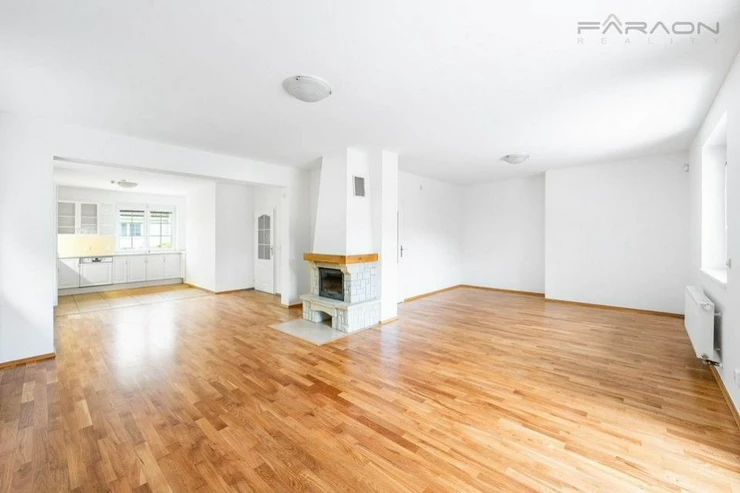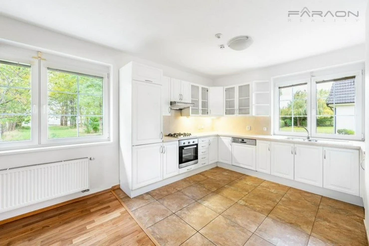 On the ground floor of the house there is an entrance hall with a built-in wardrobe, a fully equipped kitchen (ceramic hob, oven, microwave, fridge, freezer and dishwasher) with an adjoining dining room, a spacious living room with a fireplace and a separate guest room. This part of the house also includes a bathroom with a shower and toilet. In the attic there are four bedrooms, a second bathroom with a bathtub, shower and two washbasins and a separate toilet. In the basement there is a laundry room, technical facilities and a hobby room. The house also has a double garage. The property has a well-kept garden of 500 m2. The house has TV/SAT wiring, telephone line, lighting in all rooms and an alarm with the possibility of connecting to the police. Heating is provided by gas central heating.