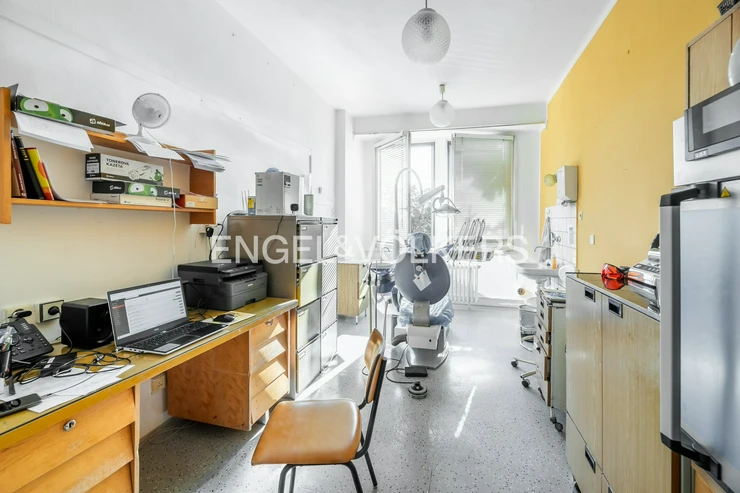 The spacious rectangular room has two plastic double-glazed windows with metal horizontal blinds, is sufficiently lit, and the natural light is complemented by two chandeliers and a lamp above each of the two sinks. The tiled floor meets hygiene requirements for easy cleaning. There is an electrical connection point in the floor for connecting a dental chair. For more information or a viewing, please contact us.