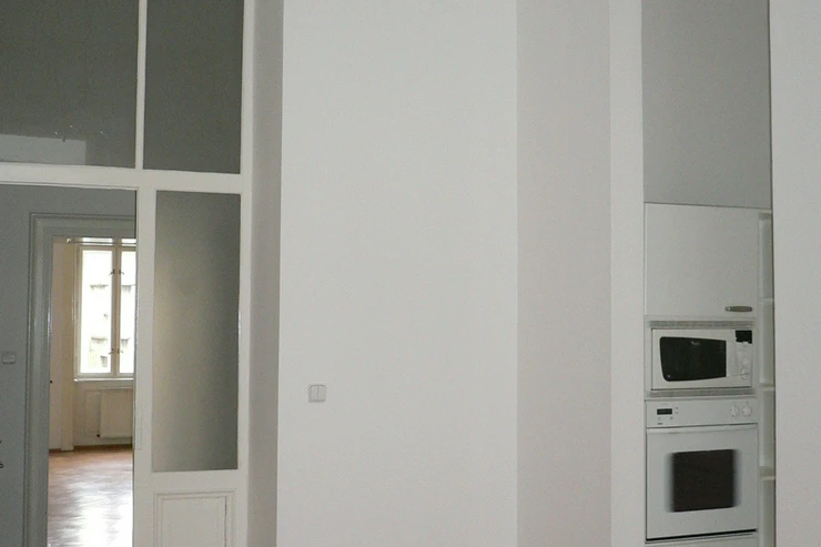 spacious entrance hall, 4 separate rooms, separate kitchen with modern fully equipped kitchenette, 2 bathrooms (one with a bathtub and toilet, the other with a shower and toilet), another toilet is separate. High ceilings and wooden parquet floors - all this underlines the historical but modern character of the office.