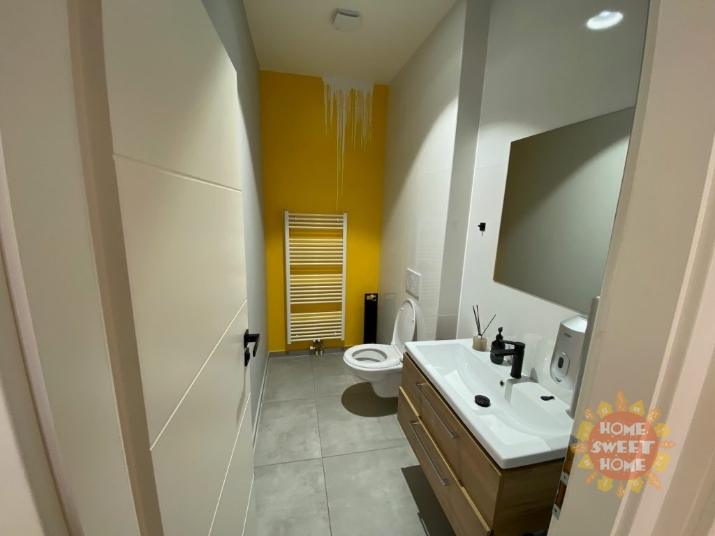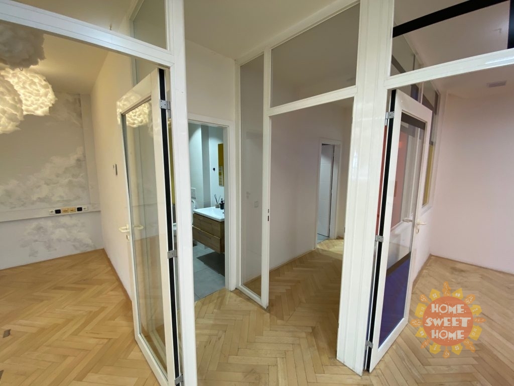 The space is air-conditioned, consisting of one large open-space area, a kitchenette, and two toilets. The parking fee is 6,000 CZK + VAT, and there is an option to rent 4 parking spaces.