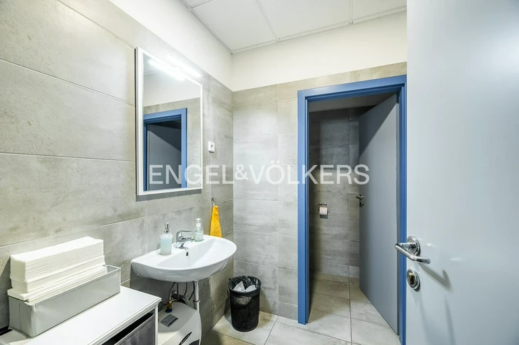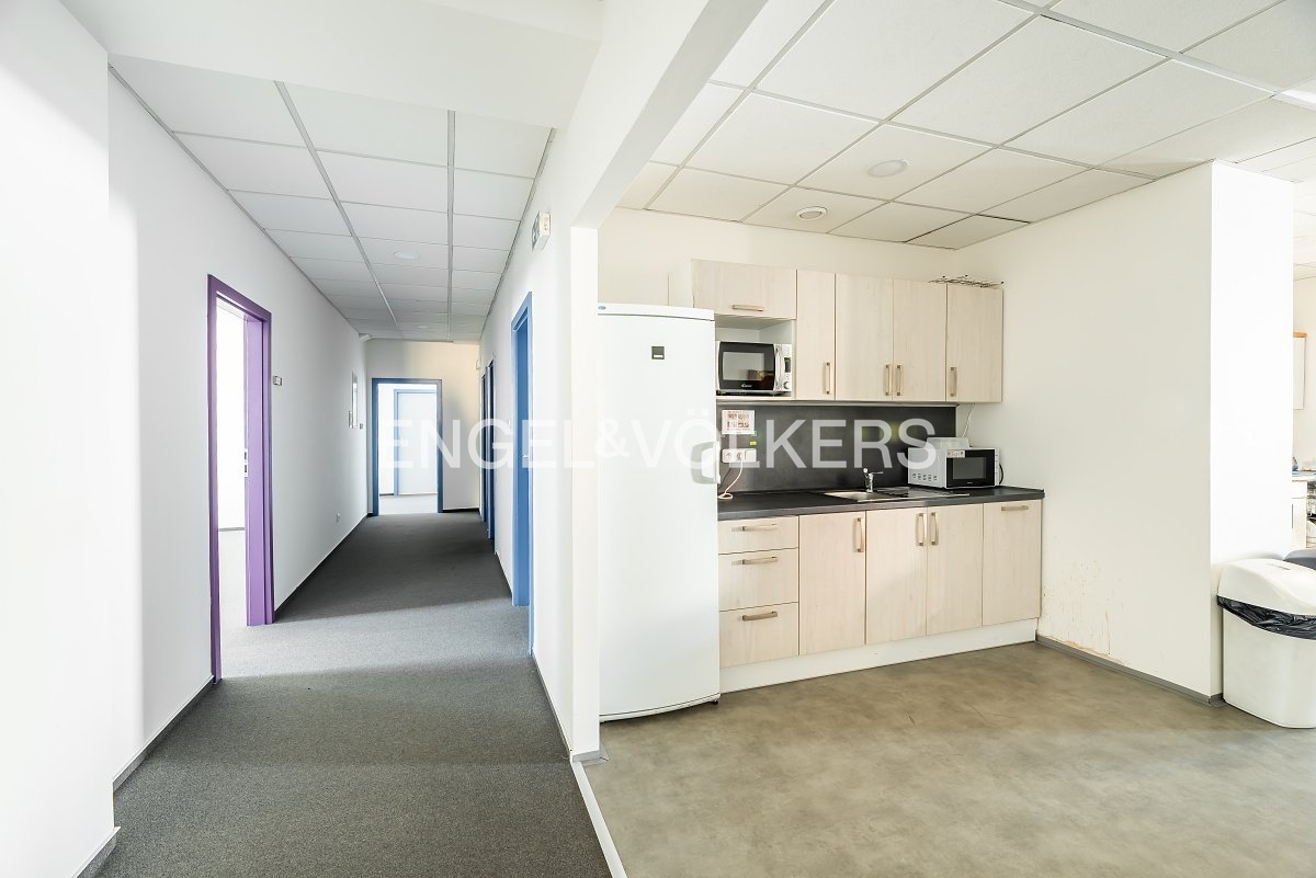 The offices are currently divided by partitions into individual rooms and a dining area with a fully equipped kitchenette, which includes a refrigerator, microwave, and dishwasher. The space also includes separate women's and men's toilets and a storage room. The layout can be adjusted according to the tenant's requirements, allowing for a high degree of variability in the use of the space.