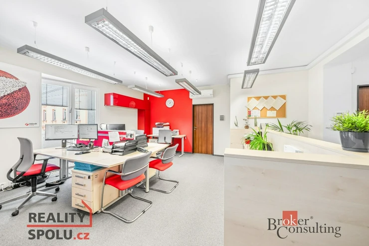 Dispozice prostor je navržena s důrazem na funkčnost a reprezentativní vzhled. Součástí je vstupní recepce, která zajišťuje profesionální první dojem pro vaše klienty a obchodní partnery. Na ni navazuje velký sdílený otevřený prostor, ideální pro týmovou spolupráci nebo coworkingové využití.