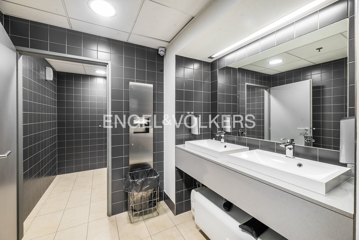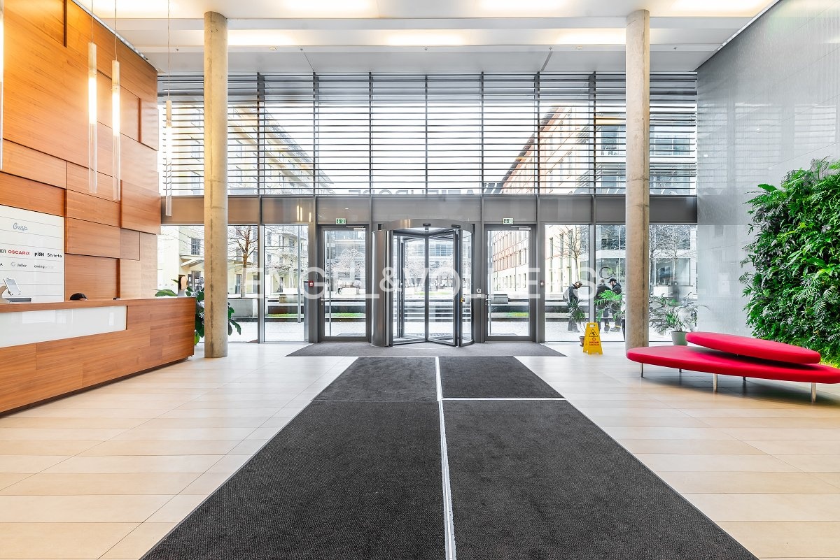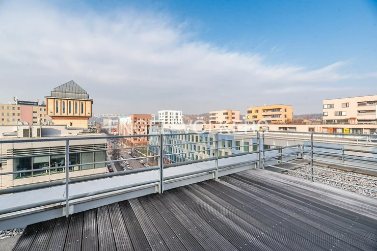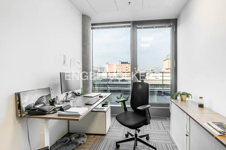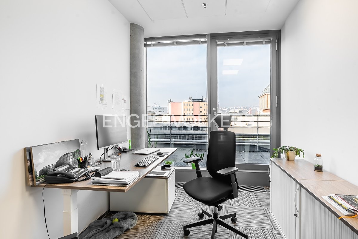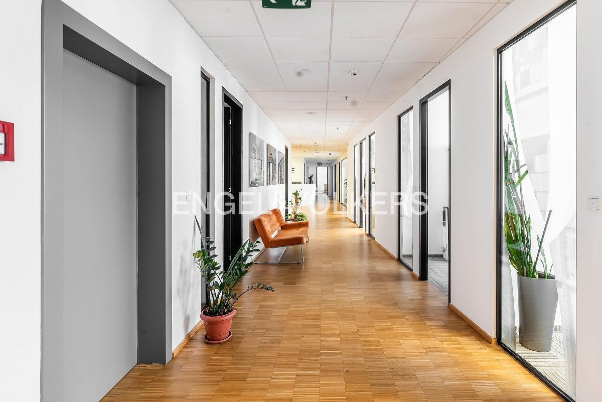 The premises also include a terrace with a beautiful view, accessible from several offices. The complex further provides bicycle facilities, changing rooms and showers for cyclists, as well as restaurants, cafés, and a canteen.