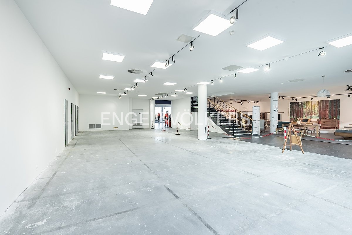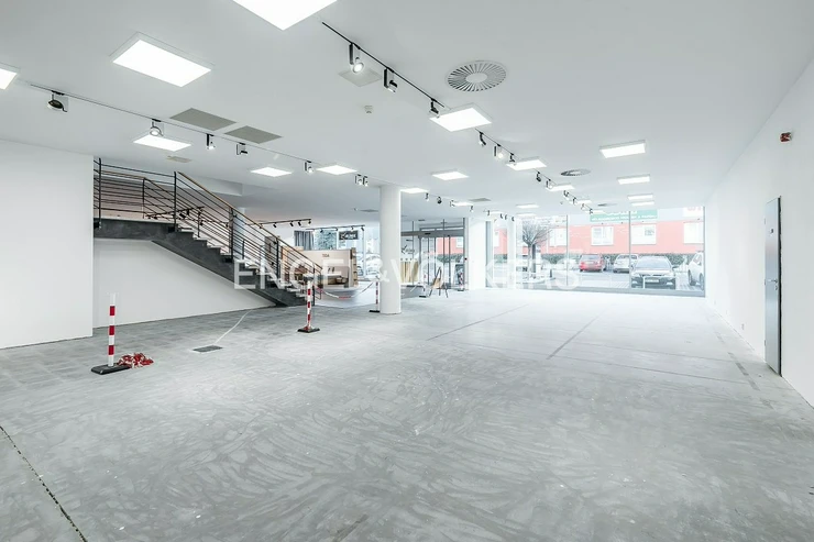 This 170 m² commercial space in the MoDo Průhonice interior design center is ideal as a retail unit, showroom, goods distribution center, or office. The space is also suitable for light manufacturing. It features a large, barrier-free main room (170 m²) with shared facilities, including a kitchenette and restrooms.