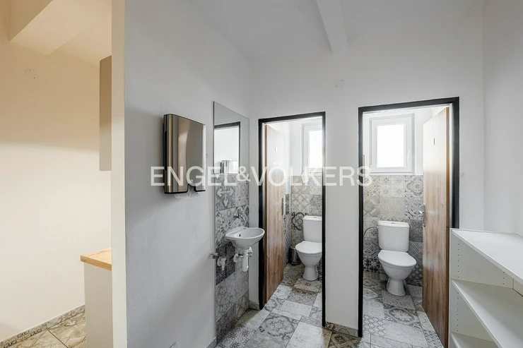 The space includes a kitchenette with equipment, two toilets, and a shower for maximum employee comfort. The offices are partially furnished, allowing for quick move-in and immediate use.