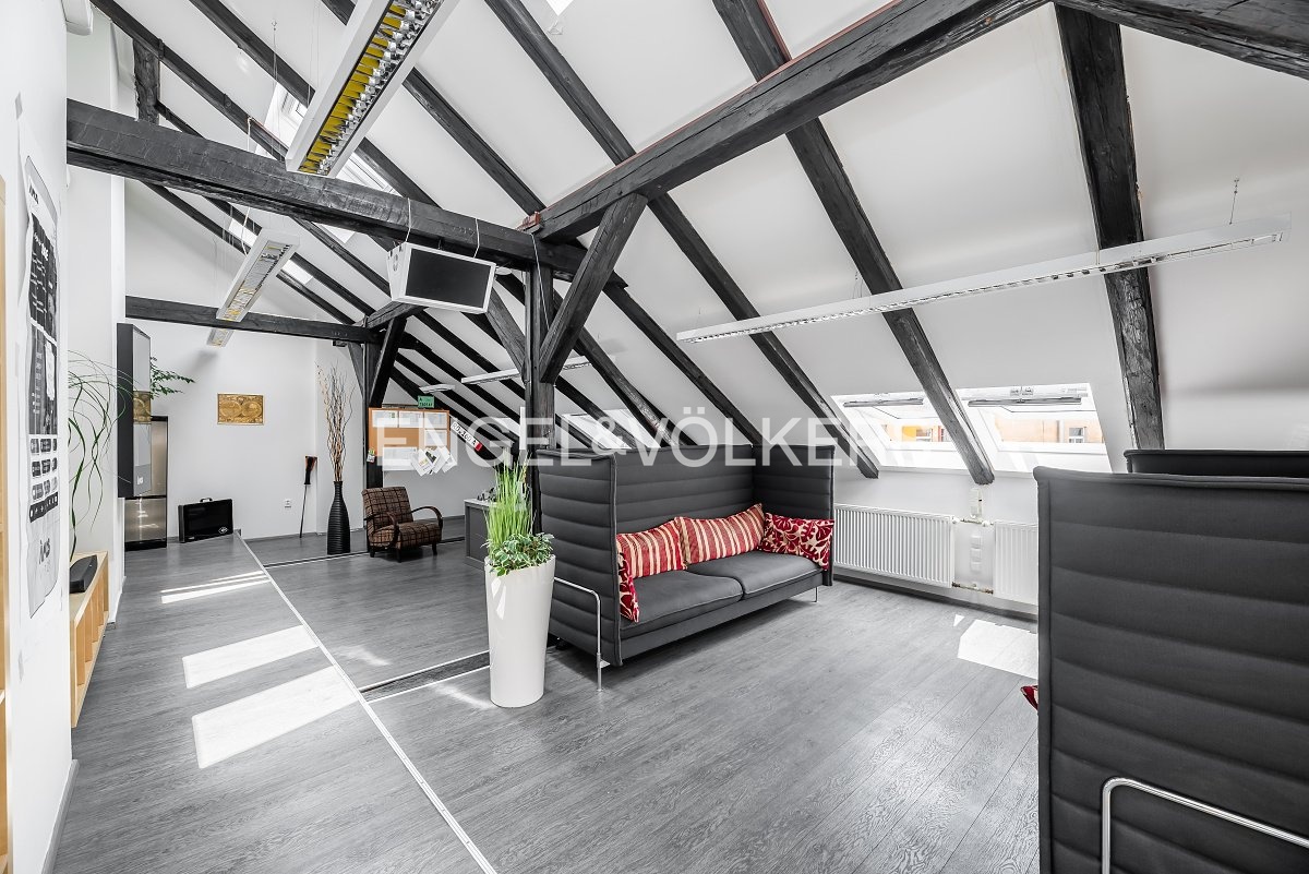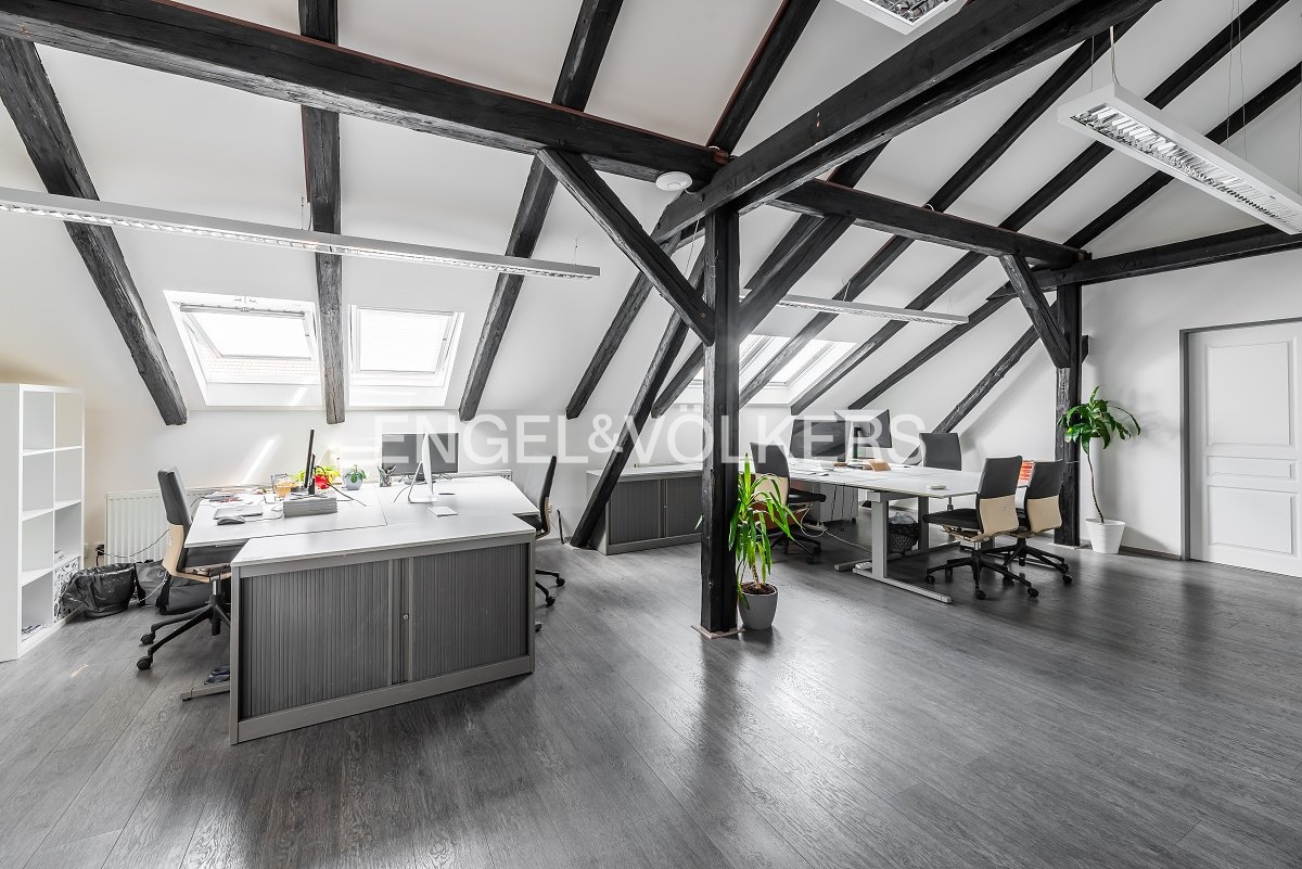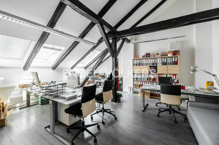 They consist of four rooms, with exposed anthracite-colored rafters that match the wood laminate flooring and door frames. Comfort during the warm months of the year is ensured by air conditioning and insulated, openable Velux windows with triple glazing and aluminium horizontal blinds. Office lighting is a matter of course.