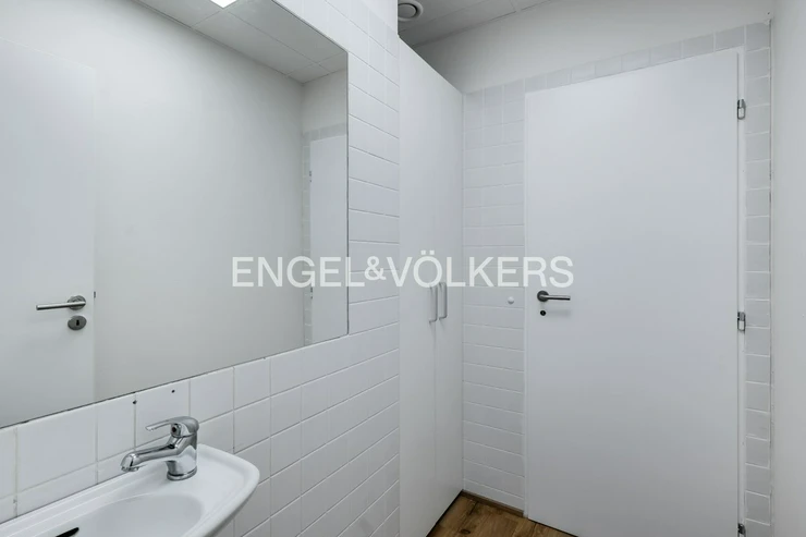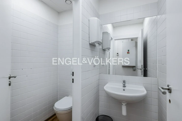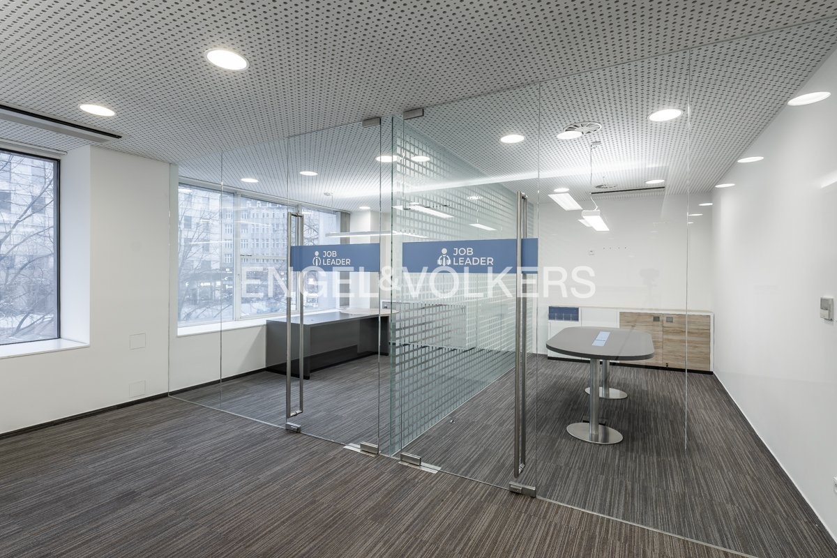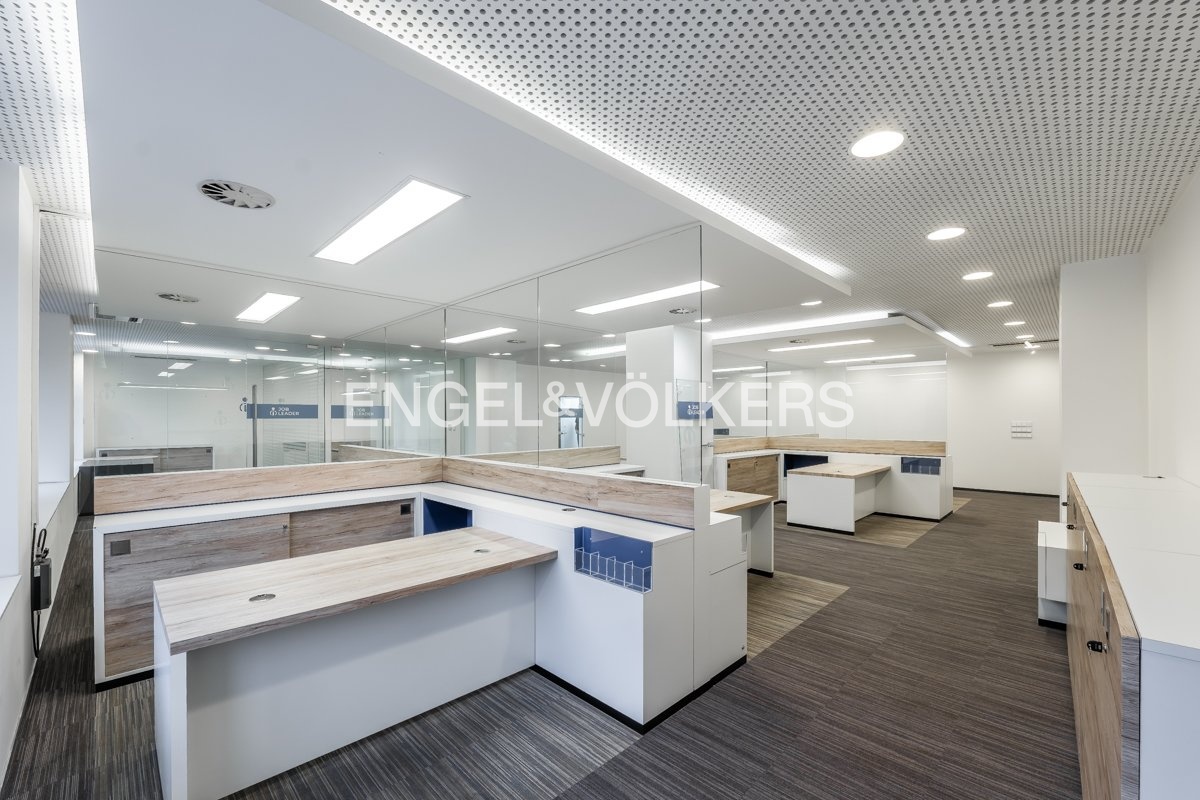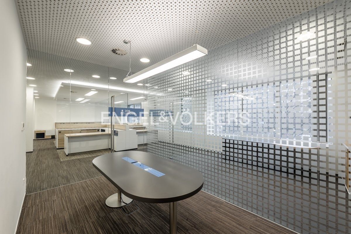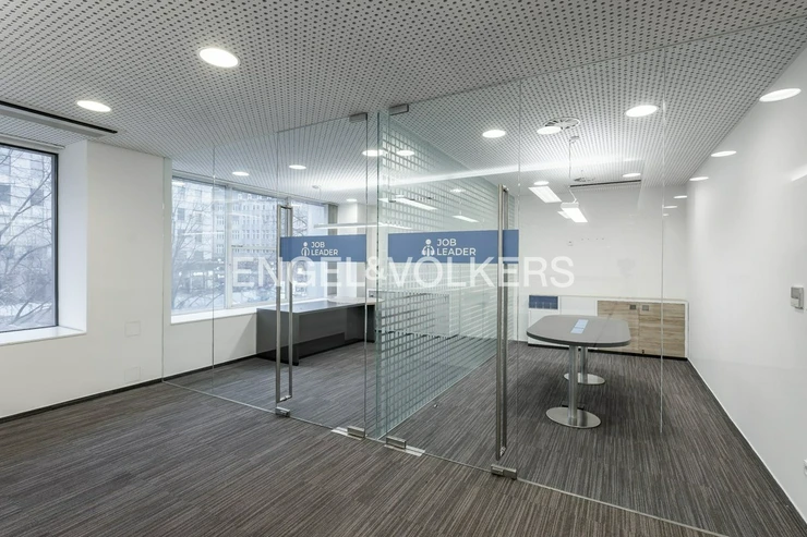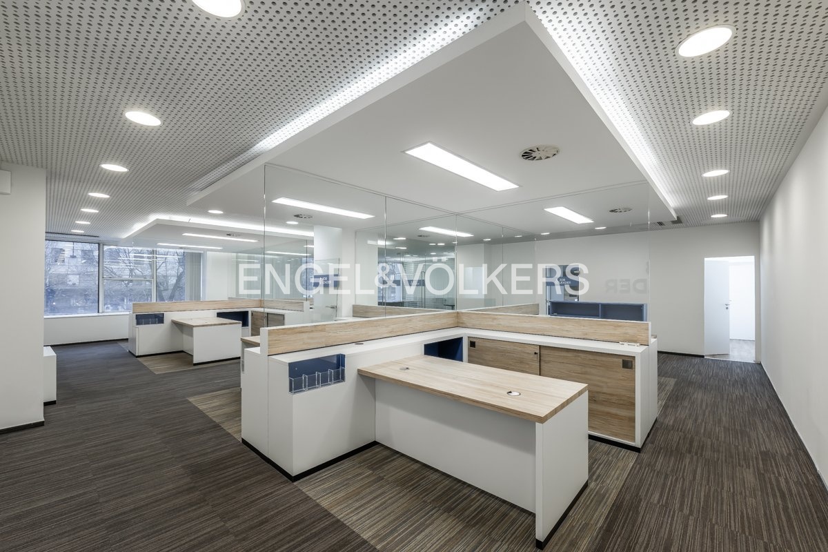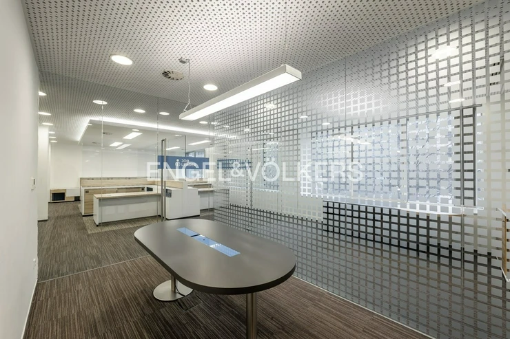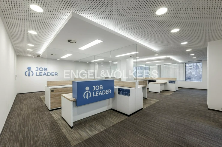 The layout of the space is designed as a modern open space with several workstations, complemented by two separate glass-walled offices that provide sufficient privacy for meetings or individual work. There is a fully equipped kitchenette and separate toilets. The space is partially furnished, allowing for immediate use without the need for high initial investment.